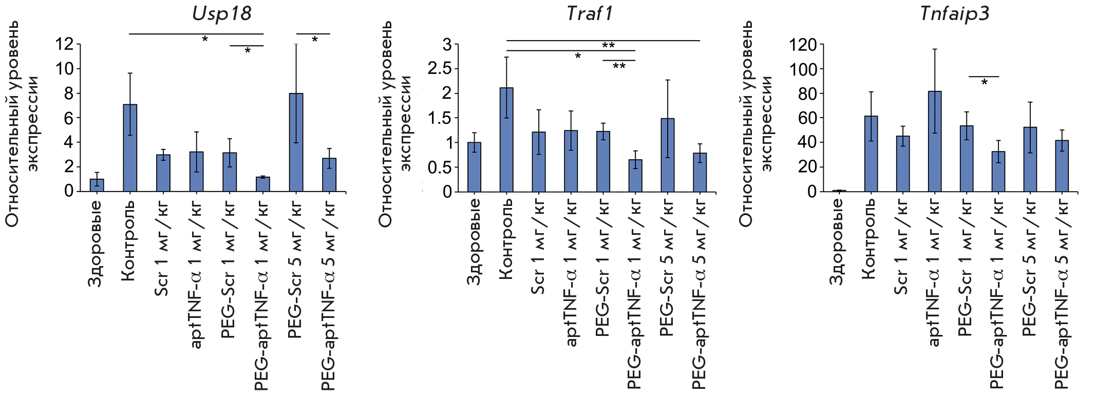 The following patterns were revealed when assessing the effect of aptamers on the expression of the studied genes in the lung tissue of mice with ALI. Administration of PEG-aptTNF-α at a dose of 1 mg/kg led to a statistically significant decline in the Usp18 gene expression level to a level typical of healthy animals: 5.9-fold vs. control and 2.6-fold vs. PEG-Scr. PEG-aptTNF-α administered at a dose of 5 mg/kg also resulted in a 2.6- and 3-fold decrease in the Usp18 expression level compared to the control and PEG-Scr groups, respectively. However, statistically significant differences were revealed only between the aptamer and scrambled oligonucleotide (Fig. 3). Administration of PEG-aptTNF-α at doses of 1 and 5 mg/kg caused a 3.5- and 2.6-fold decrease in Traf1 gene expression compared with the control and 1.8- and 1.7-fold decrease compared with PEG-Scr, respectively. However, no statistically significant differences in the effects of PEG-aptTNF-α and PEG-Scr at a dose of 5 mg/kg were observed (Fig. 3). For the Tnfaip3 gene, the only statistically significant difference was the 1.6-fold decrease in the expression level upon exposure to 1 mg/kg PEG-aptTNF-α vs. the PEG-Scr group (Fig. 3). Administration of PEG-Scr at doses of 1 and 5 mg/kg had no statistically significant effect on the expression of all the studied genes. Administration of 1 mg/kg aptTNF-α resulted in a statistically insignificant 1.7- to 2.4-fold decline in the expression levels of the Usp18 and Traf1 genes and a 1.3-fold increase in expression vs. the control group in the case of the Tnfaip3 gene (Fig. 3).