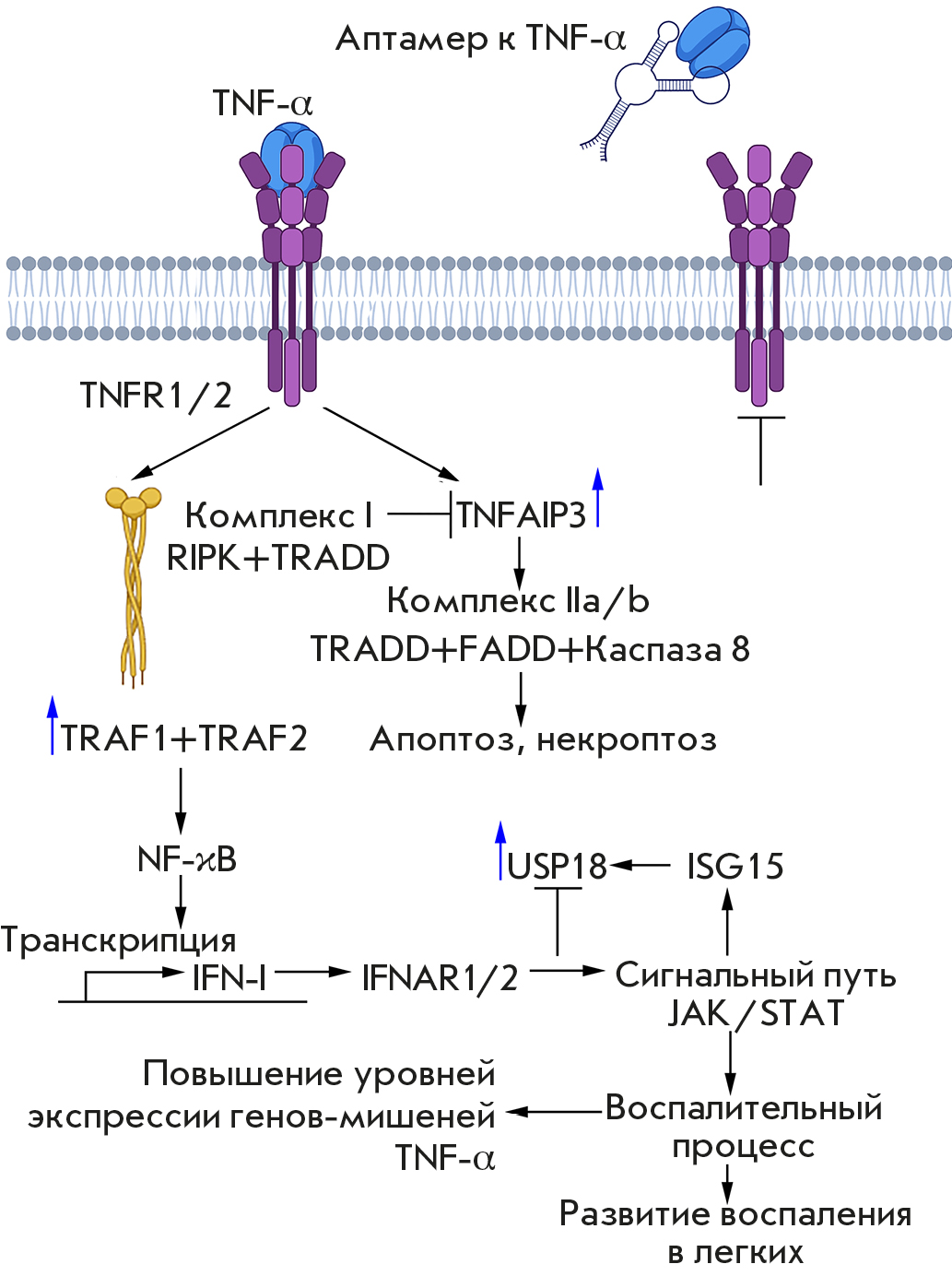 In the early phase of signaling, the soluble form of TNF-α binds to the tumor necrosis factor receptor 1 (TNFR1), causing receptor trimerization and involvement of the TNFR1-associated death domain protein (TRADD) and receptor-interacting serine/threonine protein kinase 1 (RIPK1) (Fig. 4). Next, TRADD interacts with the TRAF1/TRAF2 heterodimer to form complex I, which activates the NF-κB signaling pathway and induces the synthesis of proinflammatory cytokines, including IFN-I [33]. Through IFNAR1/2 receptors and the JAK/STAT signaling pathway, IFN-I has a further impact on the next important component of the development of the inflammatory response: the ISG15/USP18 axis, which regulates the activity of the immune system [36] and reduces the inflammatory response intensity by inhibiting the JAK/STAT signaling pathway, indicating that there possibly exists a negative feedback loop between USP18, IFN-I, and, therefore, TNF-α [43, 44].