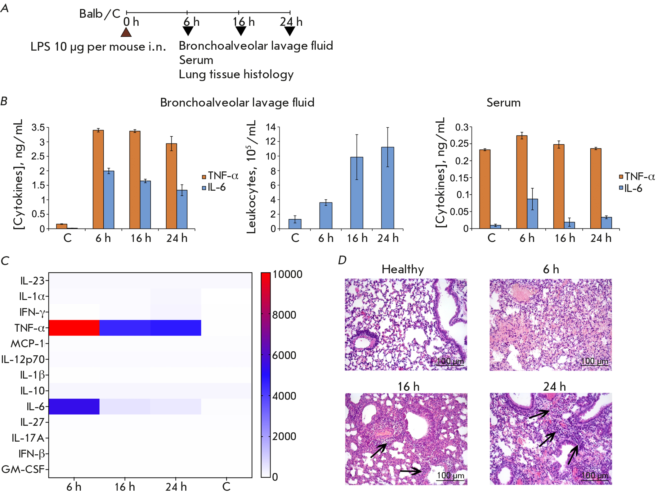 Fig. 1. The cytokine profile and inflammatory changes in the respiratory system of mice with LPS-induced acute lung injury over time. (A) Experimental design. Acute lung injury (ALI) was induced in Balb/C mice by intranasal (i.n.) administration of LPS (10 μg/mouse). Material was collected 6, 16, and 24 h after induction. (B) The levels of proinflammatory cytokines (TNF-α and IL-6) and the total leukocyte count in BALF, as well as serum levels of TNF-α and IL-6 in ALI mice 6, 16, and 24 h after induction. (C) The cytokine profile of BALF of ALI mice over time, assessed using multiplex ELISA. Data are presented as pg/mL. (D) Histological analysis of the lung tissue of ALI mice 6, 16, and 24 h after induction. Hematoxylin and eosin staining, original magnification 200×. Black arrows indicate inflammatory infiltration. C – control (healthy animals)