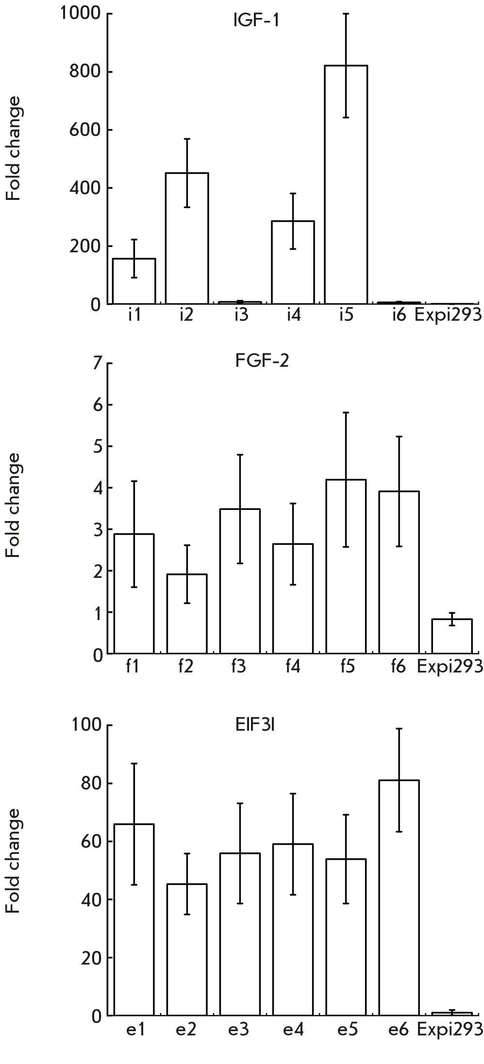 Fig. 1. Fold change of IGF1, FGF2, and EIF3I genes in Expi-dCas9-MS2 cell lines transduced with lentiviral vectors encoding sgRNAs targeting the promoter regions of the respective genes. Lentiviral vectors encoding i1–i6, f1–f6, and e1–e6 sgRNAs (Appendix 2) were used to activate IGF1, FGF2, and EIF3I gene expression. IGF1 expression is not typical of HEK cells; so, fold change was calculated relative to the lowest IGF1 expression in the modified cell line (Expi-dCas9-MS2-i6). FGF2 and EIF3I are expressed in human embryonic kidney cells; so, changes in the expression levels were evaluated relative to the Expi-dCas9-MS2 cell lines. Data are presented as a mean ± SEM