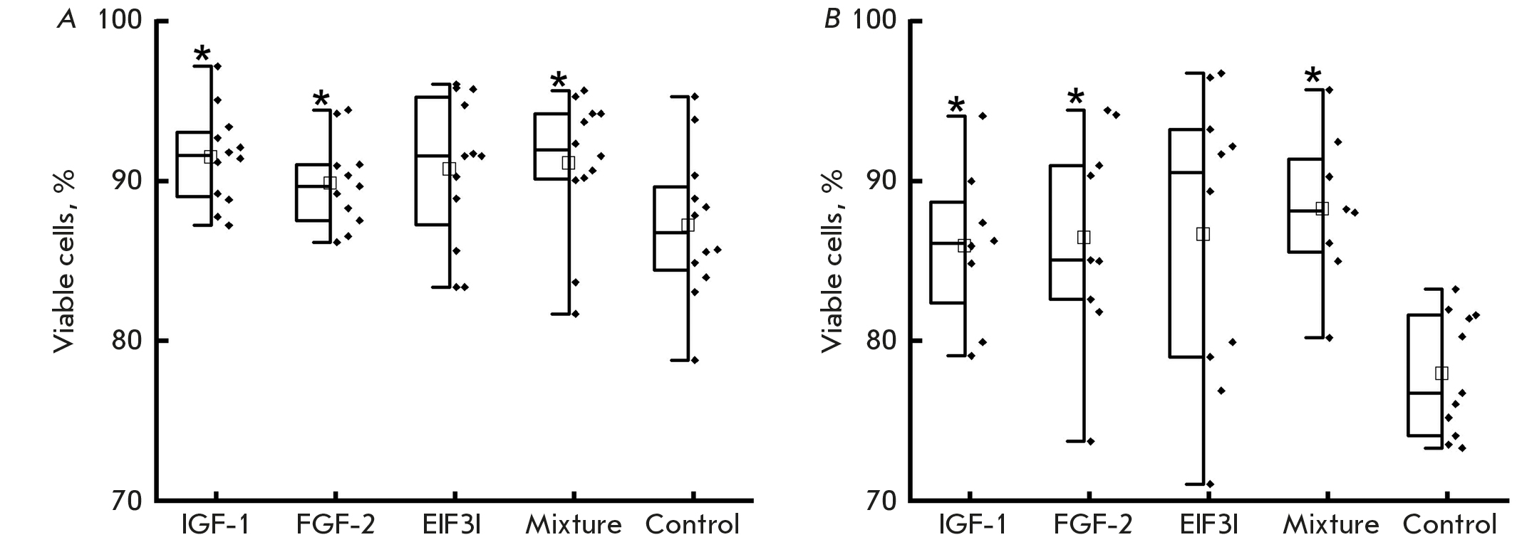 Fig. 6. Viability assay of cells cultured in a conditioned medium from modified cells. IGF1, FGF2, EIF3, Mixture, and Control are conditioned media from the corresponding Expi293F-dCas9-MS2 cell lines transduced with the i2, f6, and e6 lentiviral vectors, respectively. A culture medium from non-modified Expi293F-dCas9-MS2 cells was used as the control. Data are presented as box-and-whisker plots, with the box indicating the 25th and 75th percentiles, the whiskers representing the interquartile range, the black line within the boxes representing the median, the square representing the mean, and the asterisk (*) indicating significant differences from the control at p < 0.05. Dots are viability values for each replicate. (A) Conditioned medium mixed with a Opti-MEM medium; (B) conditioned medium mixed with a DMEM medium free of FBS