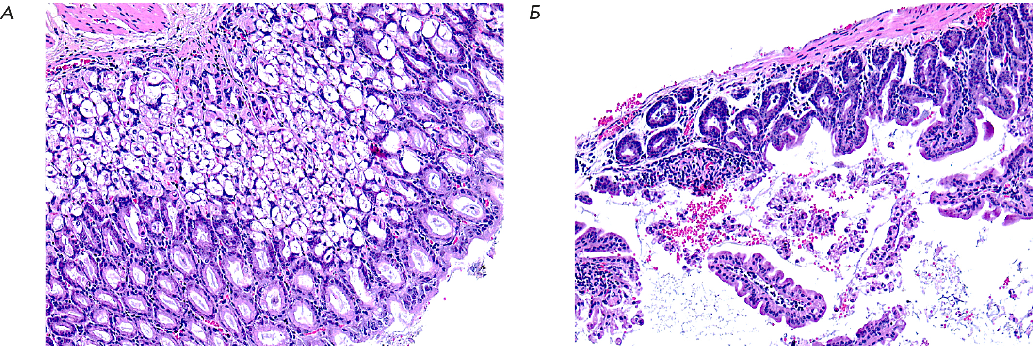 Рис. 2. Фрагмент слизистой оболочки стенки желудка (А) и тонкого кишечника (Б) подопытной мыши после введения 5' - нораристеромицина в дозе 80 мг/кг. Окраска гематоксилином-эозином. Увеличение 200