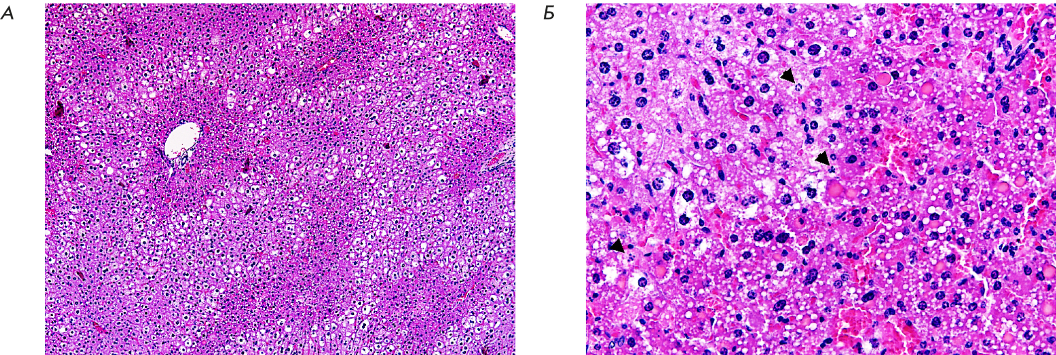 В ткани печени отмечали тотальную дискомлексацию печеночных балок, выраженный перипортальный стеатоз в сочетании с центролобулярными участками гибели гепатоцитов (рис. 3А). При этом, согласно морфологическому исследованию, в гибели части печеночных клеток были признаки апоптоза, а другая часть клеток подвергалась некротическим изменениям (рис. 3Б). В относительно сохранных гепатоцитах отмечали или пикноз ядер, или перераспределение хроматина в подмембранное пространство ядра.