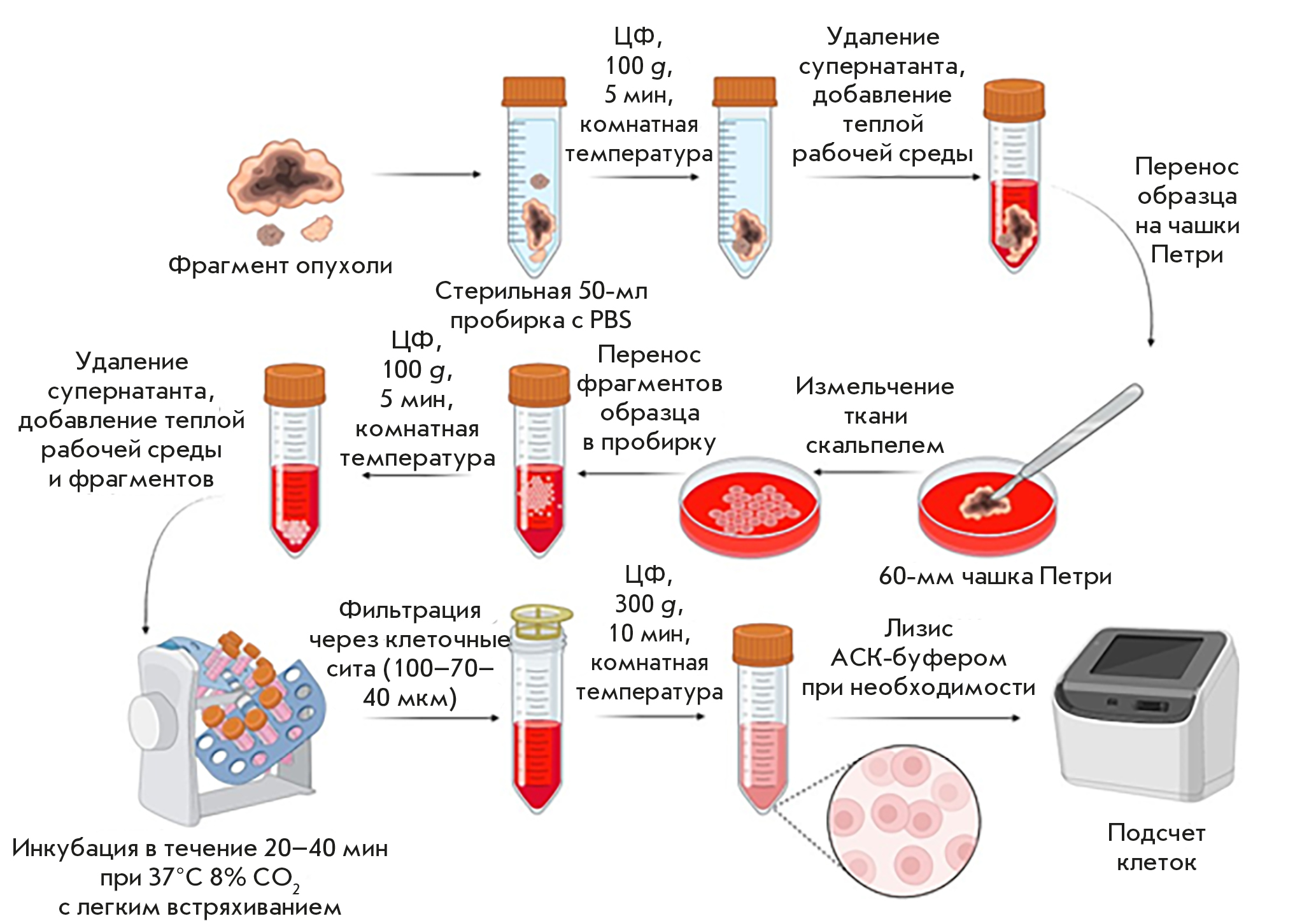 The study included 50 patients with malignancies of various nosologies: CRC (n = 31), NSCLC (n = 13), and CCRCC (n = 6). Cells were isolated from tumor material according to the protocol in [18] with some modifications. The final workflow for preparing a homogeneous cell suspension included mechanical mincing of the sample, dissociation of tissue fragments with a mixture of enzymes, and three successive stages of filtration through cell sieves with pore sizes of 100, 70, and 40 μm (Fig. 1).