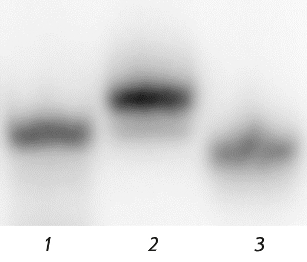 Fig. 3. A comparison of electrophoretic mobility among 16-mer DNA duplexes. An autoradiograph of a polyacrylamide gel after electrophoresis under nondenaturing conditions. Lane 1 – nFluS-dsDNA, lane 2 – nFluL-dsDNA, and lane 3 – NM-dsDNA
