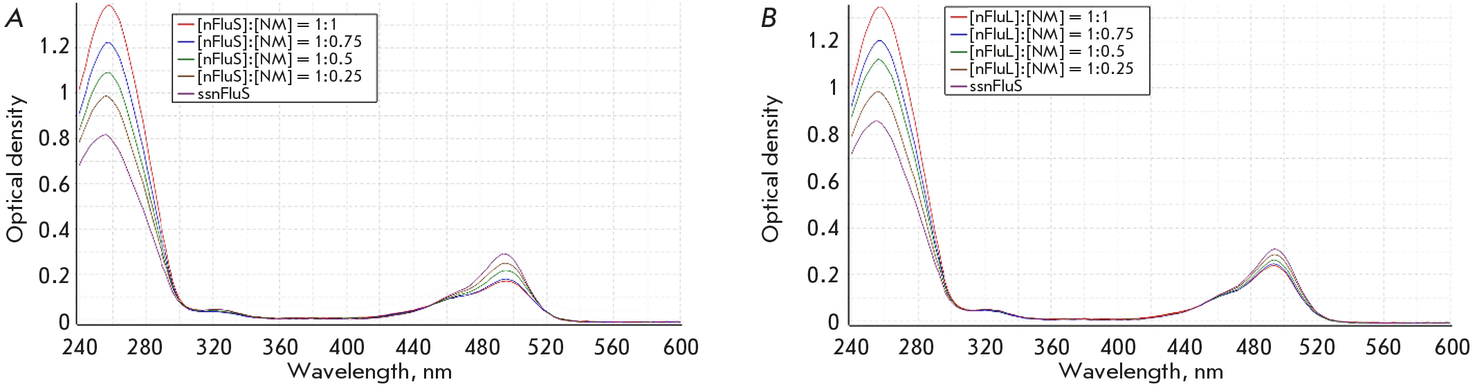 A comparison of optical absorption between nFluS-DNA and nFluL-DNA via titration of unmodified DNA was performed next. It showed that in the region of maximum nucleotide absorption (260 nm) in both DNA series, along with an increase in the optical density, an identical hypochromic effect was present, all due to the formation of duplexes (Fig. 6). The nature of the changes in the optical density near the maximum fluorescein absorption (495 nm) differed: in the case of DNA duplexes containing nFluS, the hypochromic effect, which appeared at the maximum concentration of the intact strand, amounted to 40%, whereas in DNA duplexes containing nFluL, it did not exceed 20% (Fig. 6).