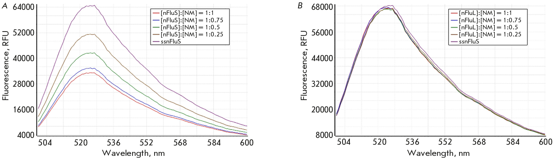 Fig. 8. Fluorescence emission spectra of the series of samples containing nFluS (A) or nFluL (B) at 5.4 μM and the complementary strand without modifications (nm)