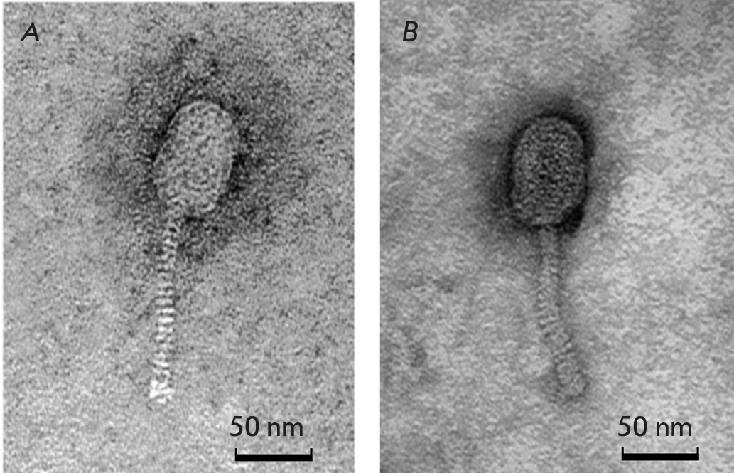 Phage samples were fixed in a 1.5% glutaraldehyde solution in 0.1 M Sorenson phosphate buffer (pH 7.2) for 20 min at room temperature. Subsequently, 5 µL of the fixed sample was transferred to a supporting copper mesh (mesh-400) coated with a nitrocellulose (parlodium) film and kept for 2 min to deposit dispersed particles on the film surface. The contrast in a sample was increased by negative contrast [18, 19]. To achieve this, a drop (2 µL) of a 2% uranyl acetate solution was pipetted onto a drop of a fixed sample located on a grid and held for 4 min. After exposure, the excess solution was removed from the mesh surface using filter paper and placed in a vacuum chamber for final drying at room temperature.