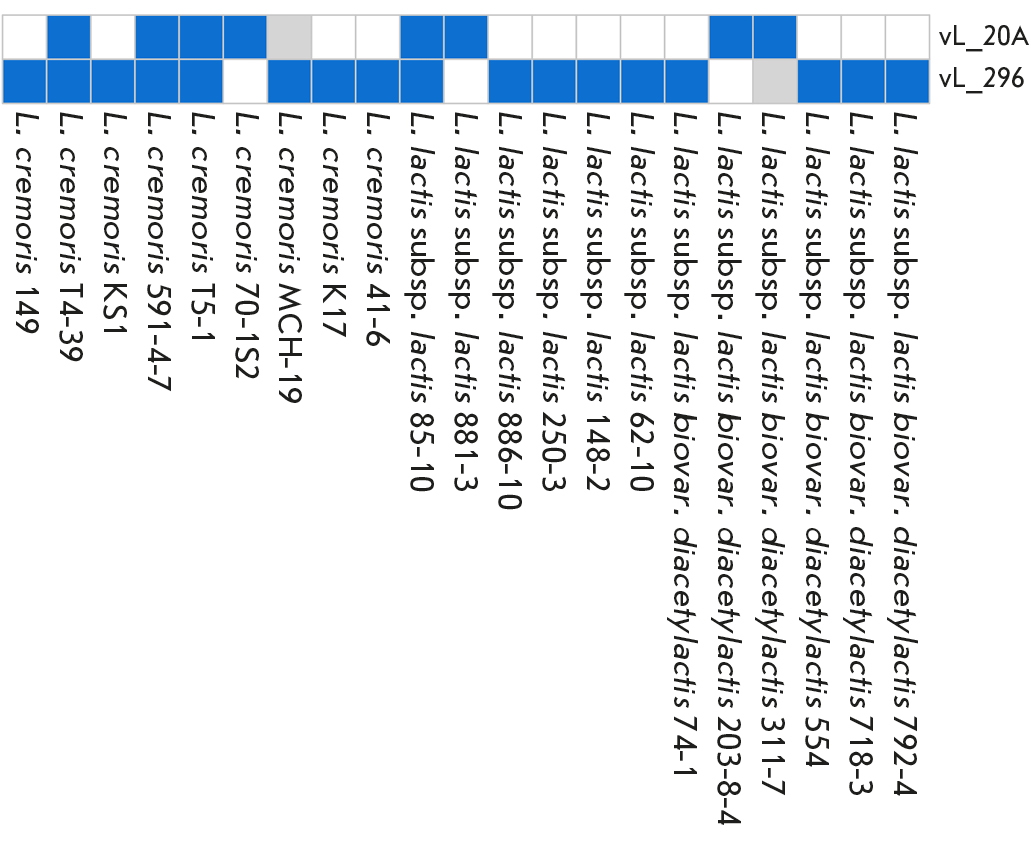Fig. 2. Host ranges of the vL_20A and vL_296 phages. Blue: presence of plaque; white: absence of plaque; gray: no analysis was conducted