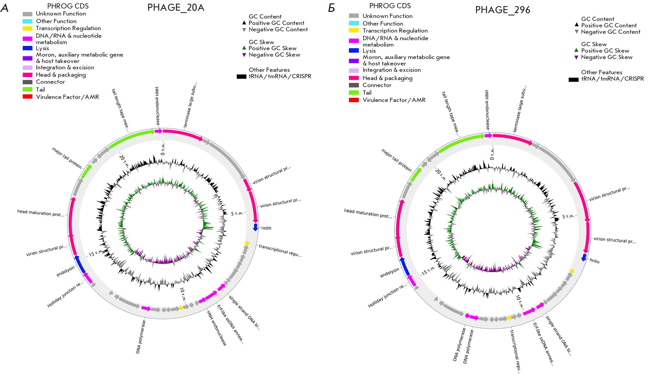 Fig. 3. Visualization of the known functional proteins encoded in the genome of Lactococcus lactis phage vL_20A (A) and Lactococcus lactis phage vL_296 (B)