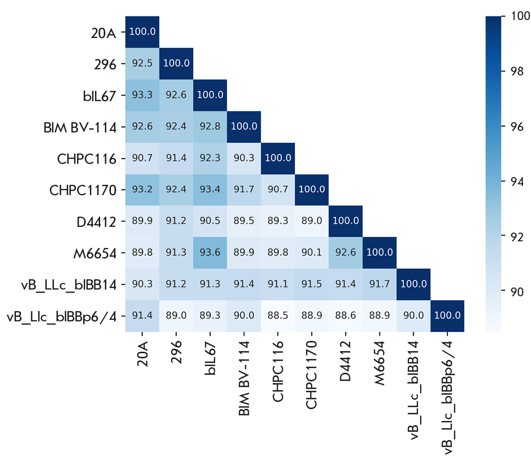 Figure 4 shows the ANI for the ten most similar phages among the 254 analyzed genomes. The vL_20A and vL_296 phages were the closest to the L. phage bIL67 (ANI 93.3 and 92.6, respectively). Note that the ANI between vL_20A and vL_296 is lower than that of the L. phage bIL67 and is 92.5 (Fig. 5). It can be assumed that vL_20A and vL_296 represent separate species not described previously.
