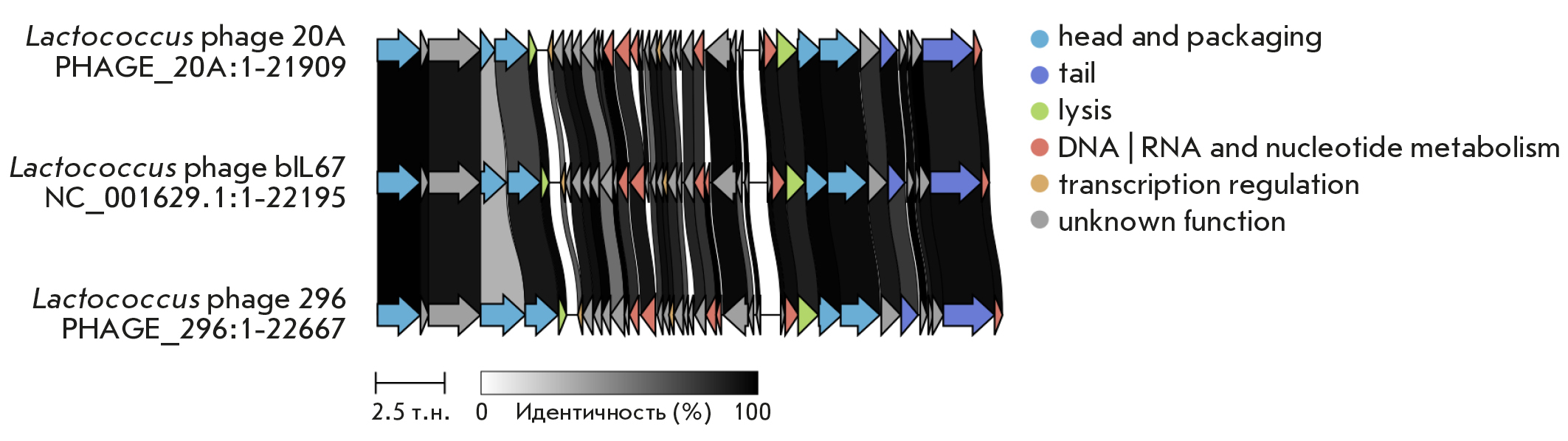 Fig. 5. Schematic diagram of the genome structure of the Lactococcus lactis phage vL_20A and Lactococcus lactis phage vL_296 compared to the most similar Lactococcus phage bIL67