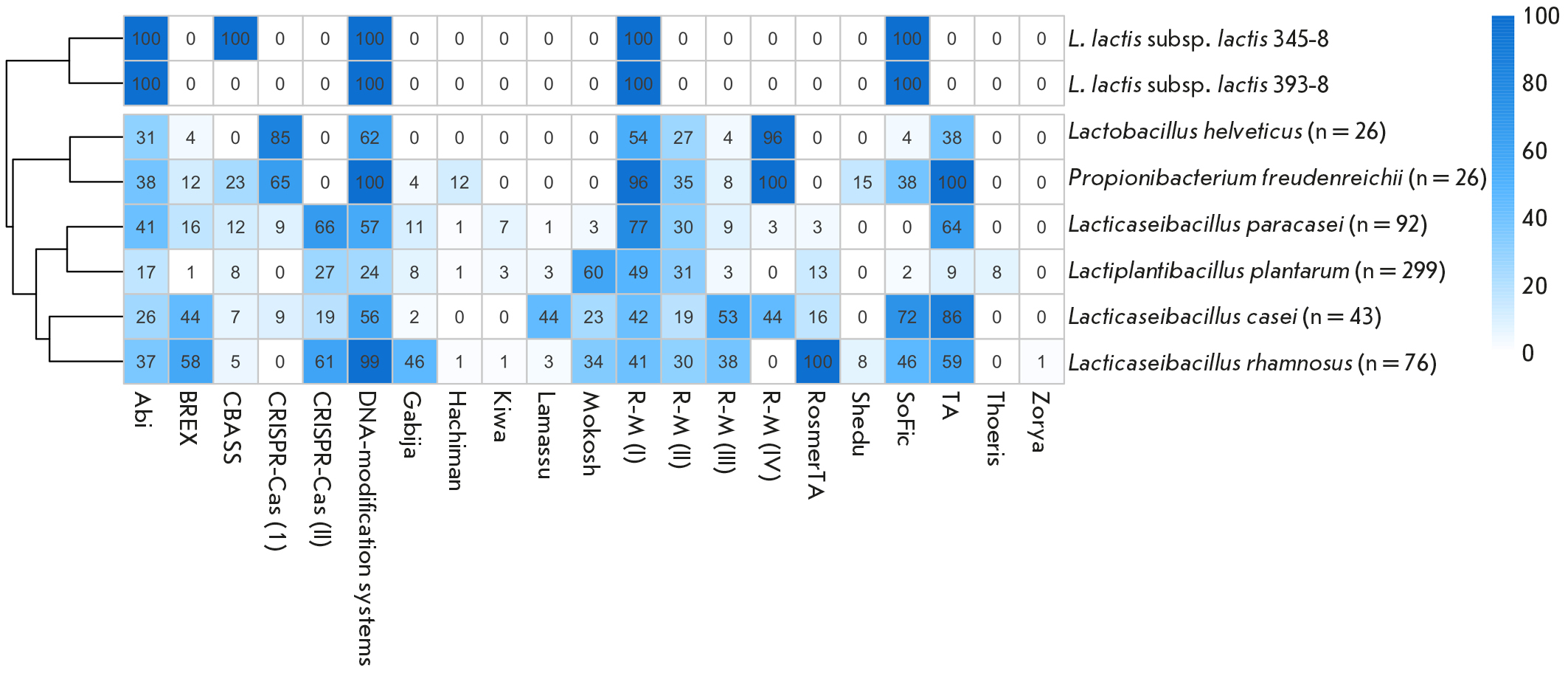 Fig. 7. The immune system of lactic acid bacteria. The cells indicate the frequency of the occurrence (%) of the immunity mechanism in starter cultures. The genus name indicates the number of analyzed genomes