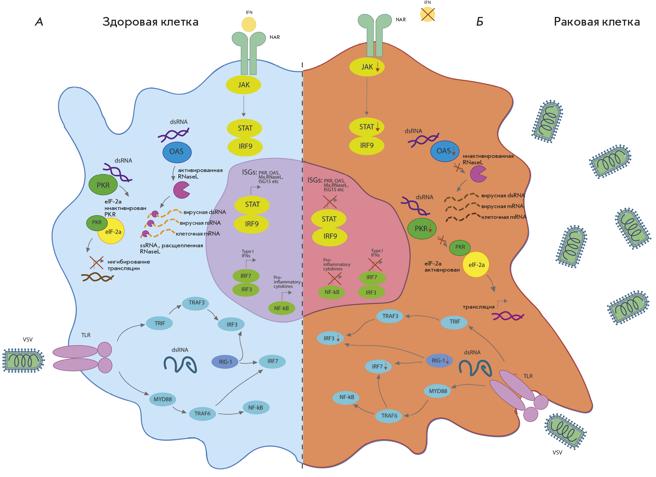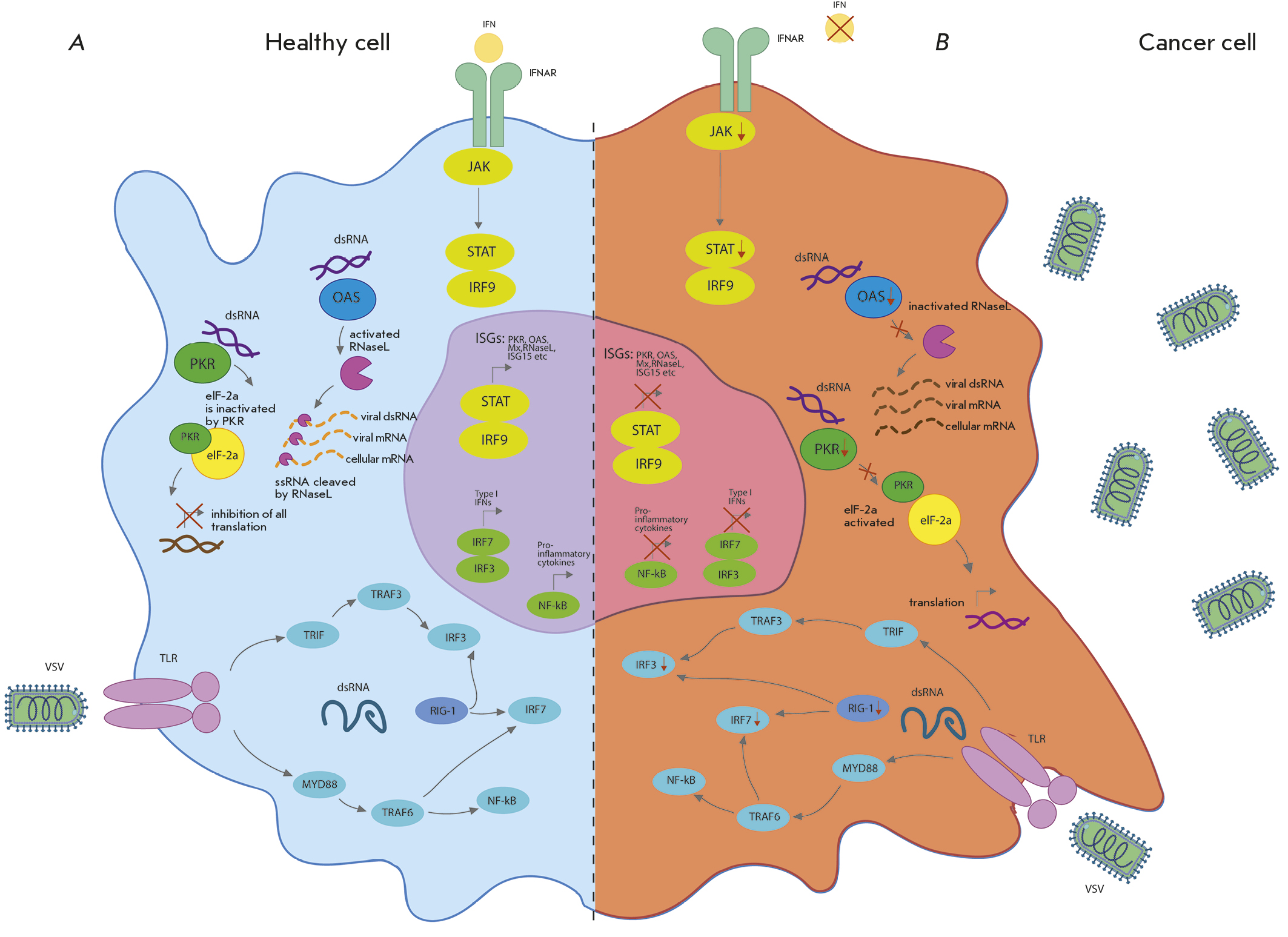 Fig. 2. A cell susceptible to VSV therapy. Knowing the molecular mechanisms underlying the differences in the susceptibility of cancer cells to viruses is essential for elaborating approaches to cancer treatment, identifying biomarkers of susceptibility to specific oncolytic viruses, predicting the effectiveness of virotherapy in each individual patient [96], and improving the effectiveness of cancer treatment