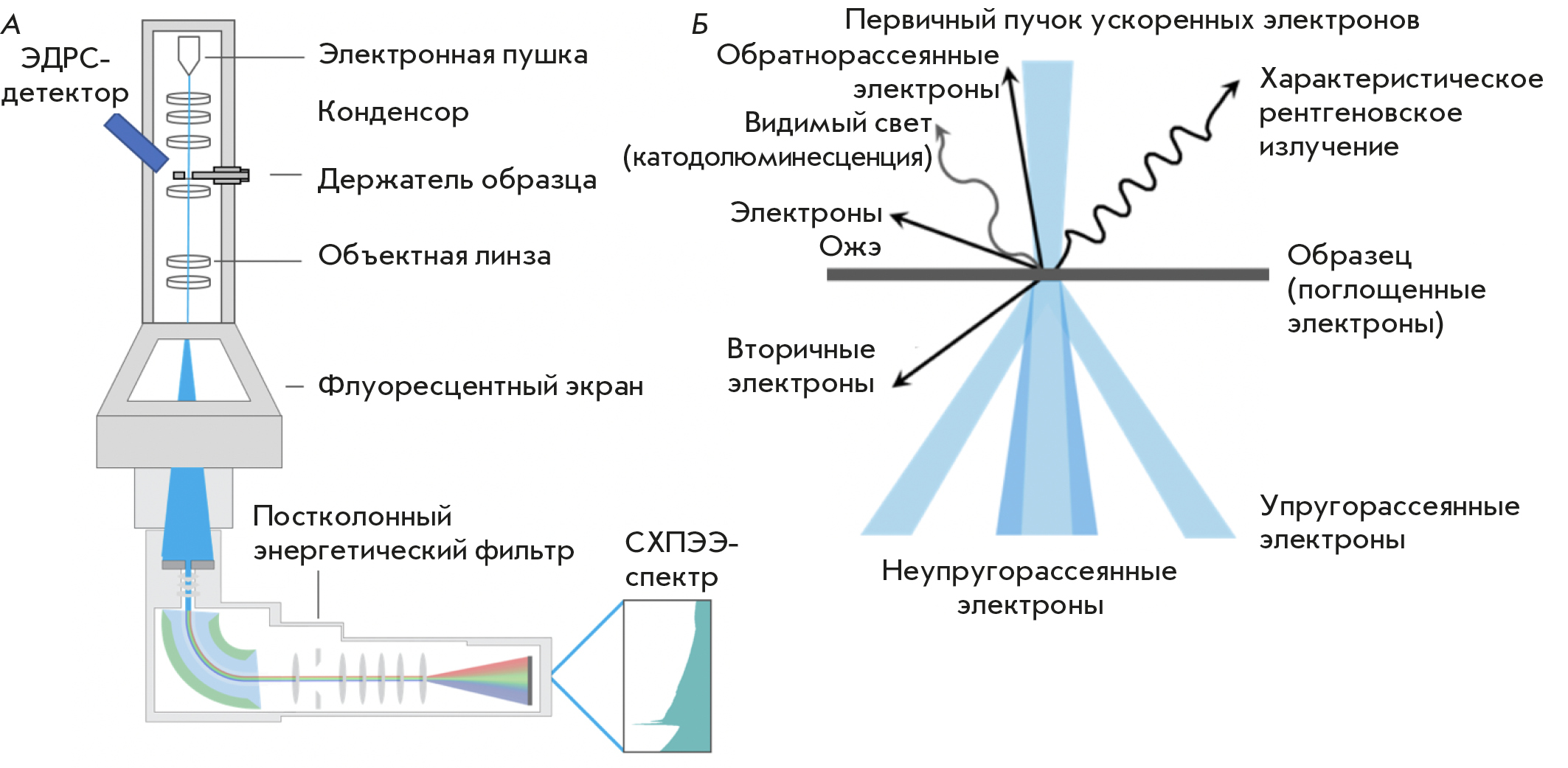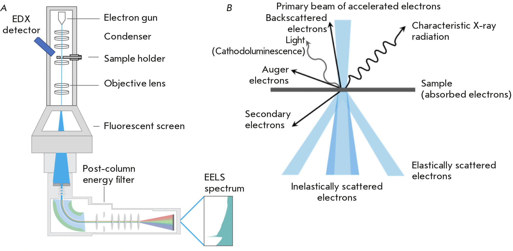 Biological and materials science research requires not only qualitative but also quantitative analysis, including mapping the elemental composition of microscopic sample areas. For this purpose, scanning and transmission analytical electron microscopes are employed. Analytical TEM detects inelastically scattered electrons. These electrons lost kinetic energy while traversing the sample within the microscope column (Fig. 1B).