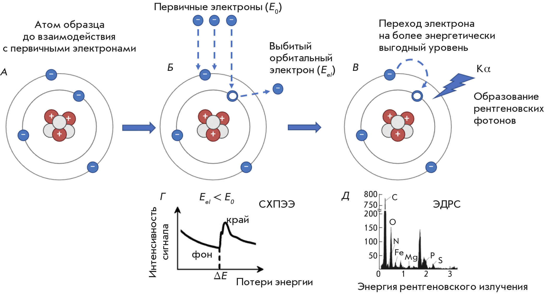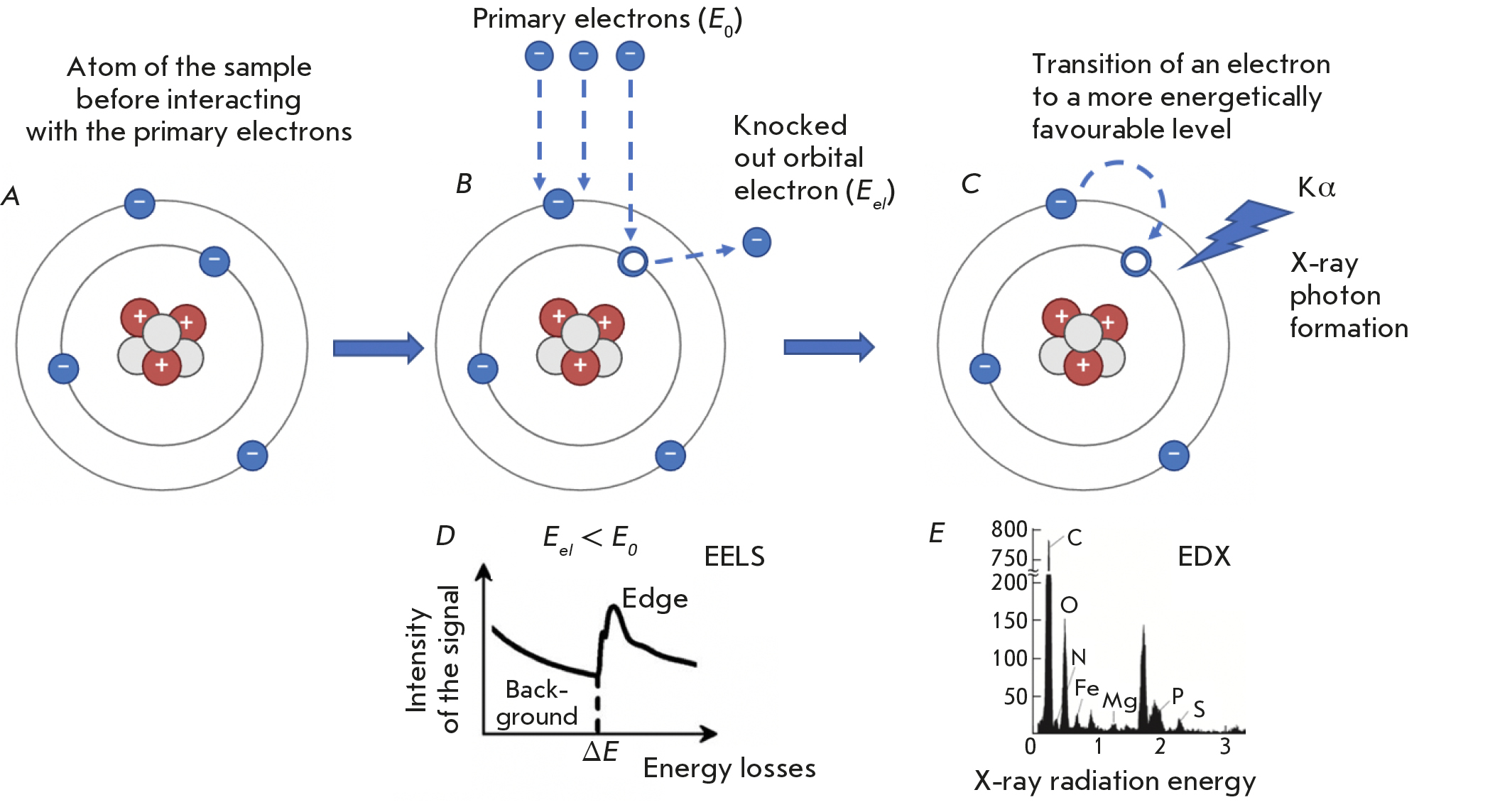 Fig. 2. Excitation of the inner shells of a sample atom in a transmission electron microscope column and the resulting EELS and EDX spectra. (А) The sample atom before interaction with the primary electron. (B) Energy loss detected by EELS. E0 – energy of the primary electron before interaction with the sample; Eel is the energy of the primary electron after interaction with the sample. (C) The generation of the X-ray radiation quantum detected by the EDX method. Kα is the X-ray photon generated by the transition of the sample atom from the excited one. (D) The electron energy loss spectrum (EELS). (E) The energy dispersive spectrum (EDX) (generated using BioRender.com)