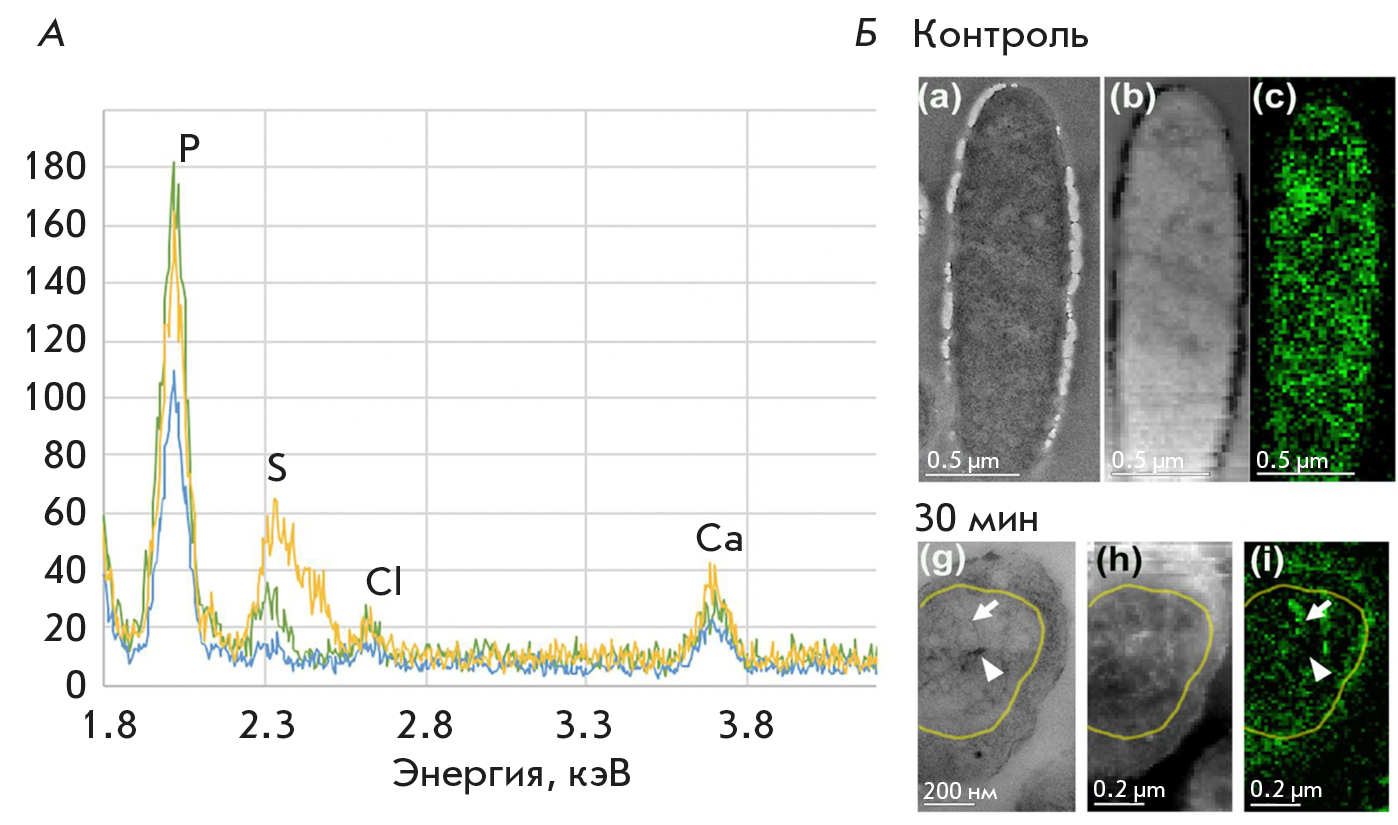 Fig. 5. Analysis of the elemental structure of bacteriophage PhiKZ-infected P. aeruginosa cells was conducted using analytical microscopy techniques. (A) EDX spectra of control cells (blue), and 15 (green) and 30 min (yellow) after infection with PhiKZ phage. The superimposed EDX spectra were normalized to the carbon peak (not shown in graph). The peaks are designated as follows: P for phosphorus, S for sulfur, Cl for chlorine, and Ca for calcium. (B) Distribution of phage and bacterial DNA in the control cells and those infected with P. aeruginosa. TEM images (a, g), HAADF images (b, h), EELS of phosphorus in the pseudonucleus (c, i). The phosphorus signal (P) is shown after background subtraction and multiple scattering correction, using Fourier deconvolution of the spectra. The arrows indicate DNA, the arrowheads indicate P-free regions, and the yellow line indicates the pseudonuclear boundary (reproduced from [25], open source)