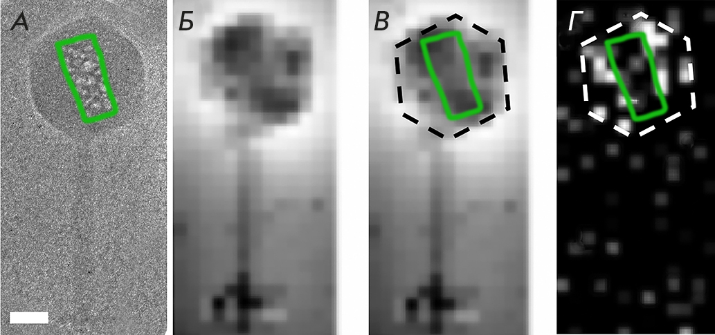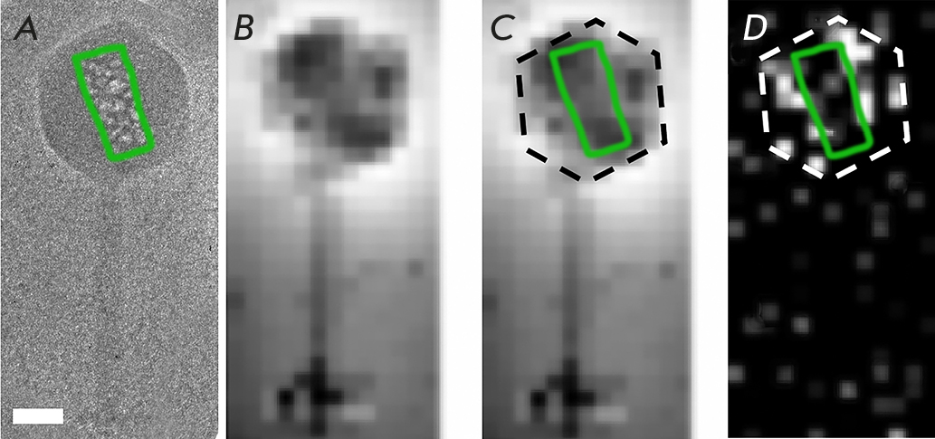 Fig. 6. Localization of the inner body in the phiEL bacteriophage, as demonstrated by phosphorus mapping. (A) A cryo-electron microscopy image of the phiEL bacteriophage subjected to high-dose electron irradiation. The inner body region is highlighted by a green line. The scale bar measures 50 nanometers. (B, C) The HAADF image of the phiEL bacteriophage. A dashed black line denotes the capsid boundary, with the inner body region indicated by a green line (B). (D) Phosphorus distribution map. The pixel intensities reflect the signal strength of the element in the characteristic electron energy loss spectra. A white dotted line indicates the limits of the capsid, with the inner body region denoted by a green line (reproduced from [31], by permission of the authors)
