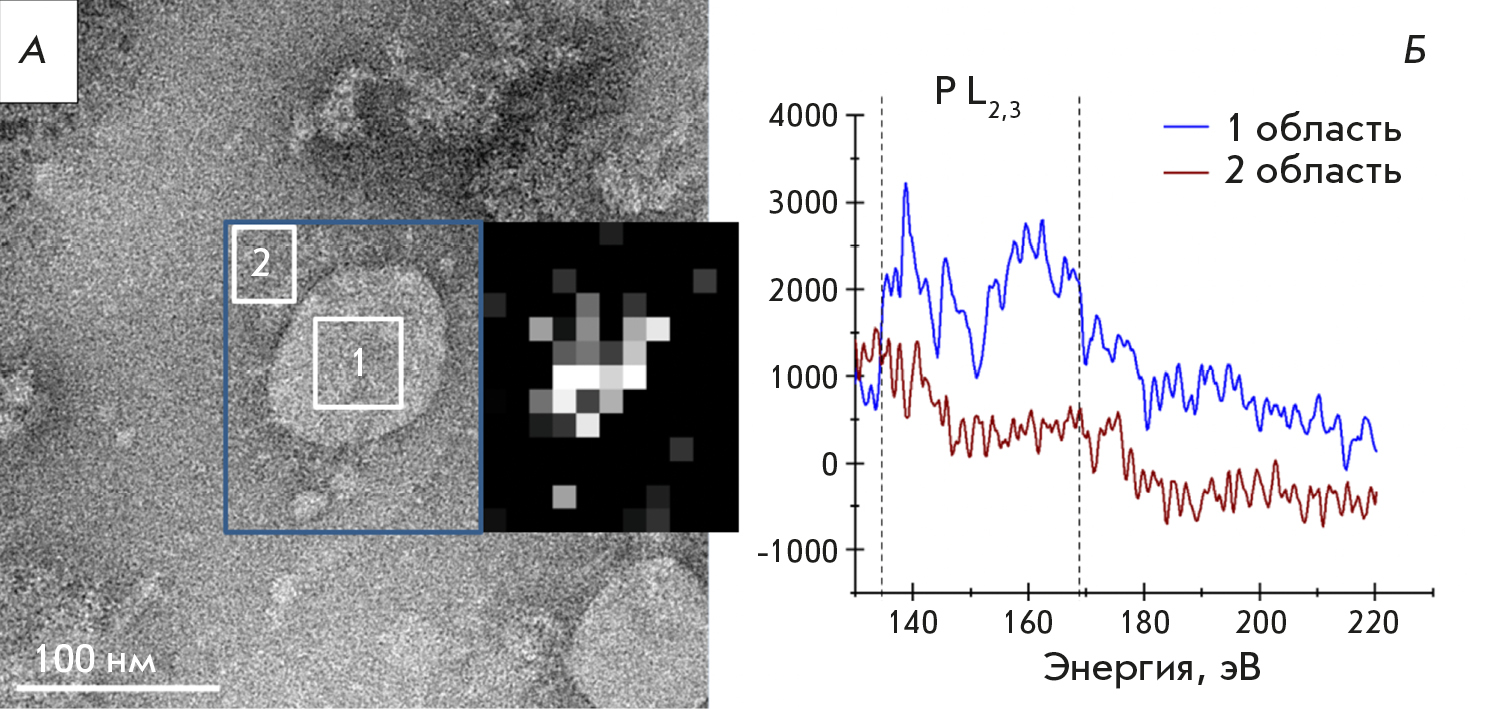 The STEM-EELS method was also used to study the phosphorus content in purified inactivated SARS-CoV-2 particles included in the CoviVac vaccine (produced by the Federal Scientific Center for Research and Development of Immunobiological Preparations named after M.P. Chumakov of the Russian Academy of Sciences) [35]. The SARS-CoV-2 virus has a diameter of around 200 nm and contains a single-stranded RNA genome of approximately 30 base pairs. Thus, the phosphorus concentration within the SARS-CoV-2 capsid is five times lower than that of giant bacteriophages, a difference that remains significant even when accounting for the viral lipid envelope. STEM-EELS analysis confirmed the presence of nucleic acid within the virions. Figure 7A shows the SEM image of the virion and the corresponding map of the local phosphorus distribution. The phosphorus signal was recorded only from the interior of the virion, and not from the substrate outside it (Fig. 7B). Based on prior findings [36] demonstrating an uneven phosphorus signal distribution within the virion, it is posited that RNA is a more plausible source than the viral lipid envelope.