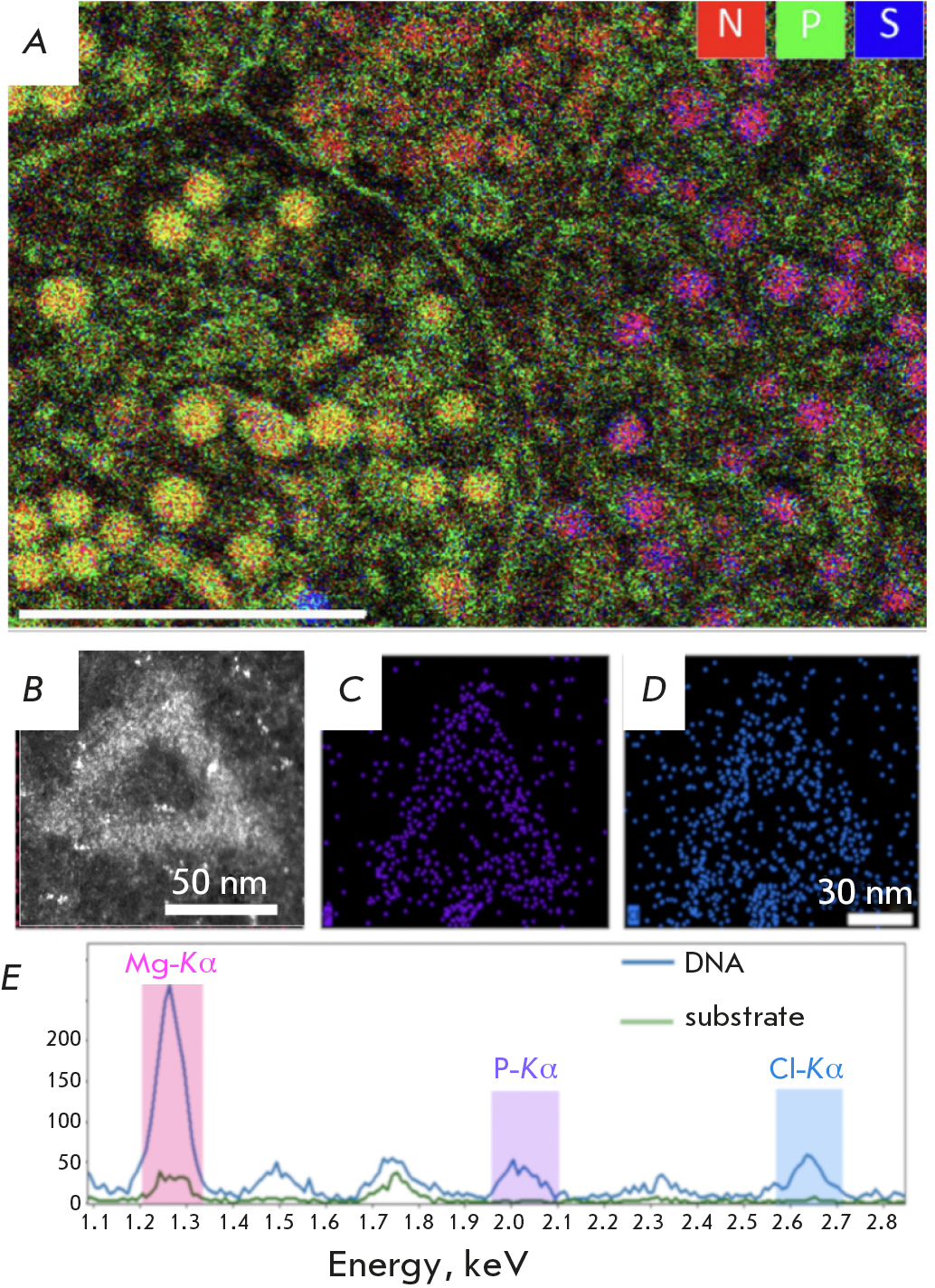 Fig. 3. Elemental mapping performed on cellular sections via EDX. (А) Rat Langerhans cells islet (reproduced from [16], open source). Overlapping the nitrogen (red), phosphorus (green), and sulfur (blue) compositional maps facilitates the discrimination of membranes and pellets according to their elemental content. The length of the scale bar is 2 μm. The HAADF image of the DNA-origami triangle (B). EDX mapping of phosphorus (C) and chlorine (D) distribution. (E) Two summed EDX spectra: the solid blue line is summed over the DNA structure while the green line is summed over the background support. Both spectra represent raw data without background subtraction (reproduced from [14], by permission of the authors)