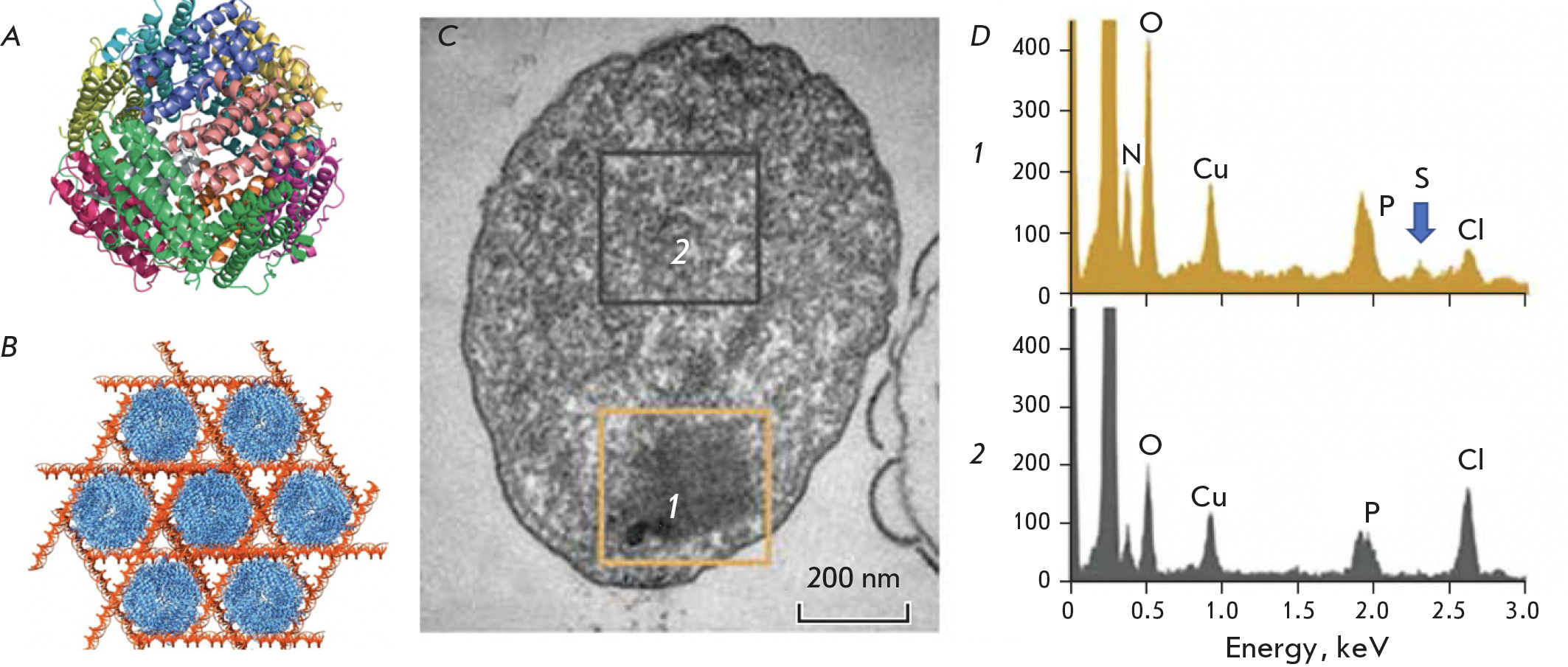 Fig. 4. (А) The structure of the Dps protein. (B) The model of nanocrystalline array during the formation of the DNA-Dps complex based on cryotomography (reproduced from [23], open source); (C) The TEM image of a nanocrystalline condensed structure of DNA-Dps in a resting E. coli cell starved for 7 months (reproduced from [20], open source): (1) nanocrystalline condensation type, (2) nucleoid control region. (D) The EDX spectra from selected regions 1 (condensed nucleoid) and 2 (control) in the previous image. The blue arrow indicates the position of the sulfur peak in the spectrum of region 1
