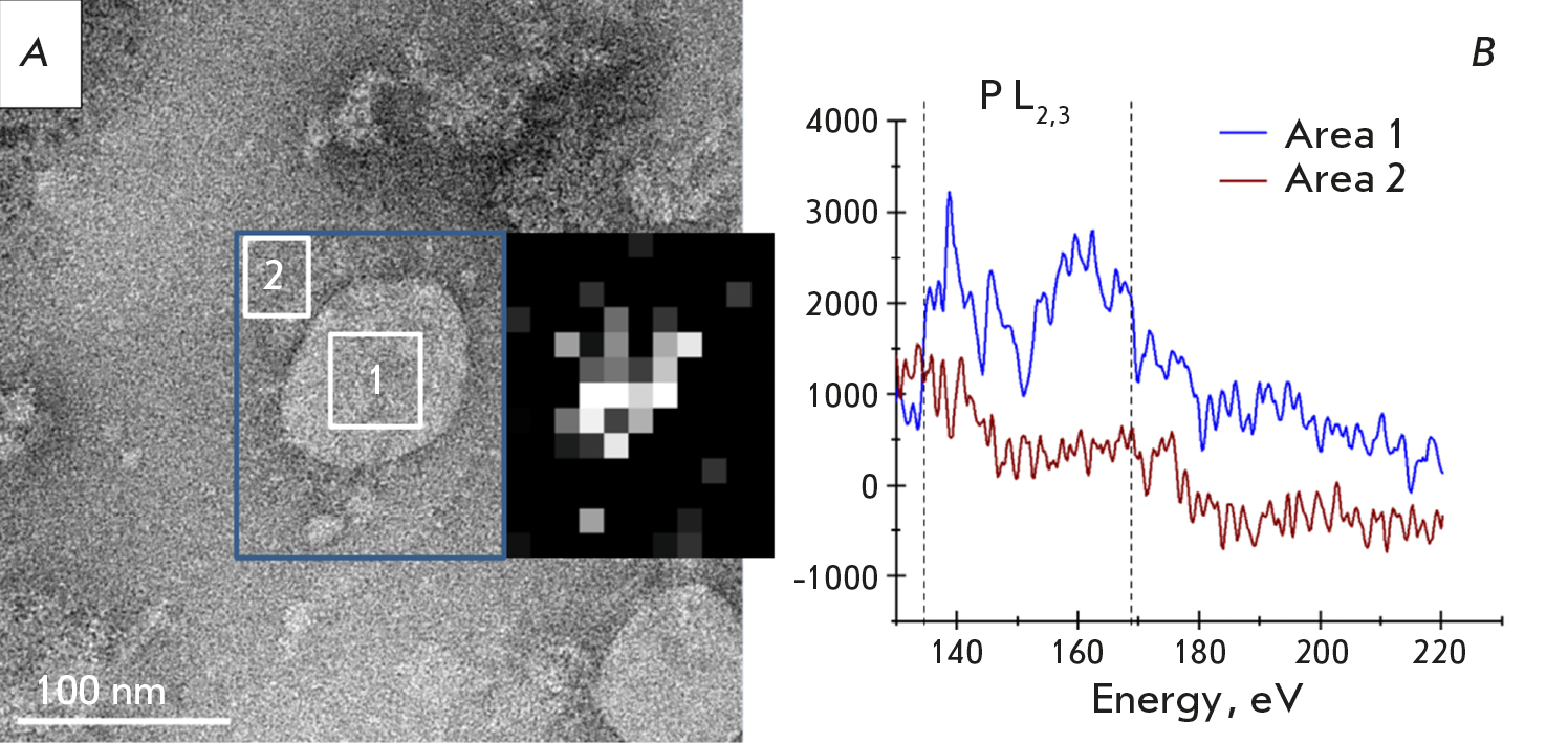 Fig. 7. Visualization and elemental analysis of the inactivated SARS-CoV-2 virion. (A) Phosphorus distribution map combined with TEM image. (B) Plots of EELS spectra obtained inside the virion (region 1 of Fig. 7A) and outside of the virion (region 2 of Fig. 7A) (reproduced from [35], by permission of the authors)