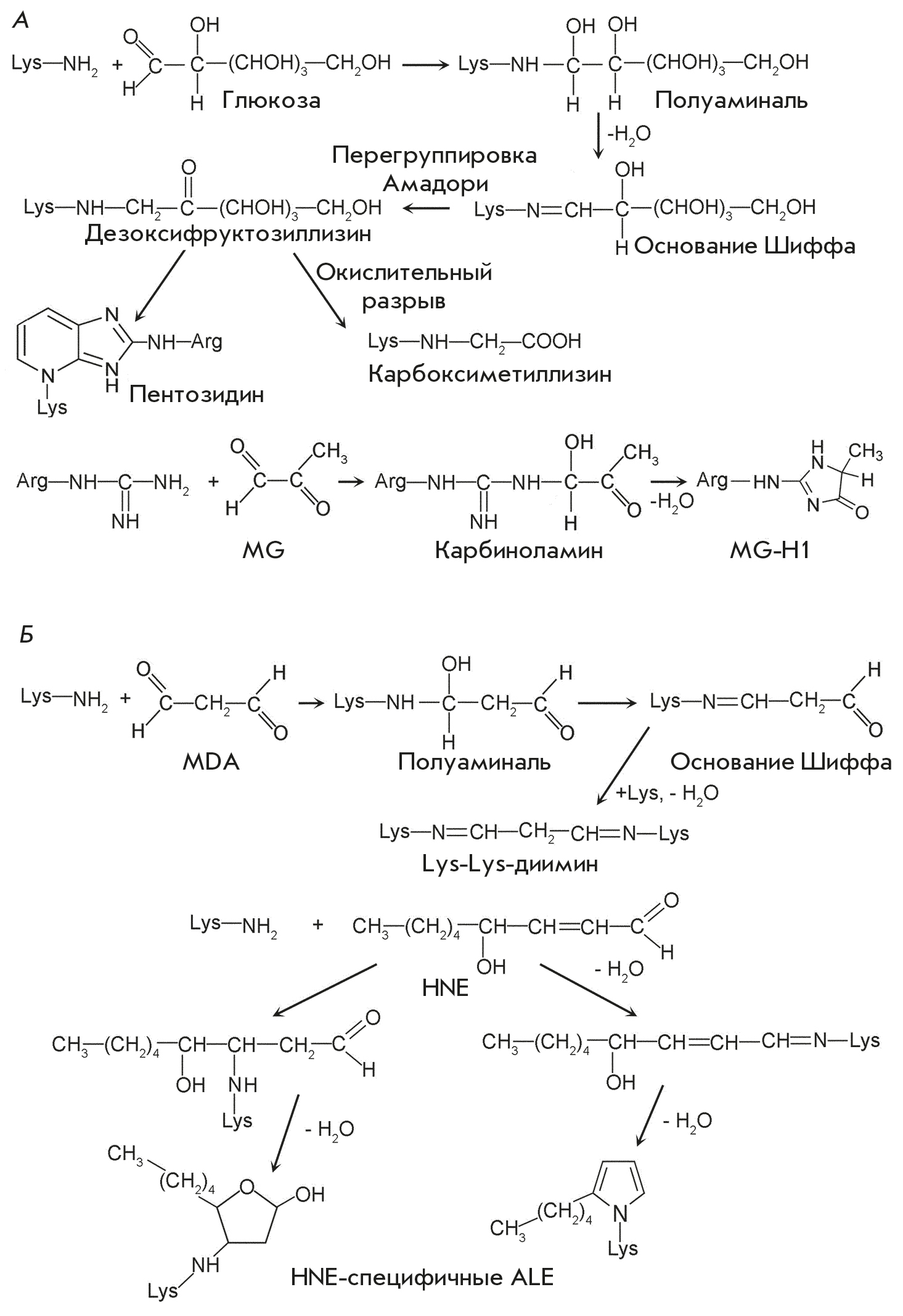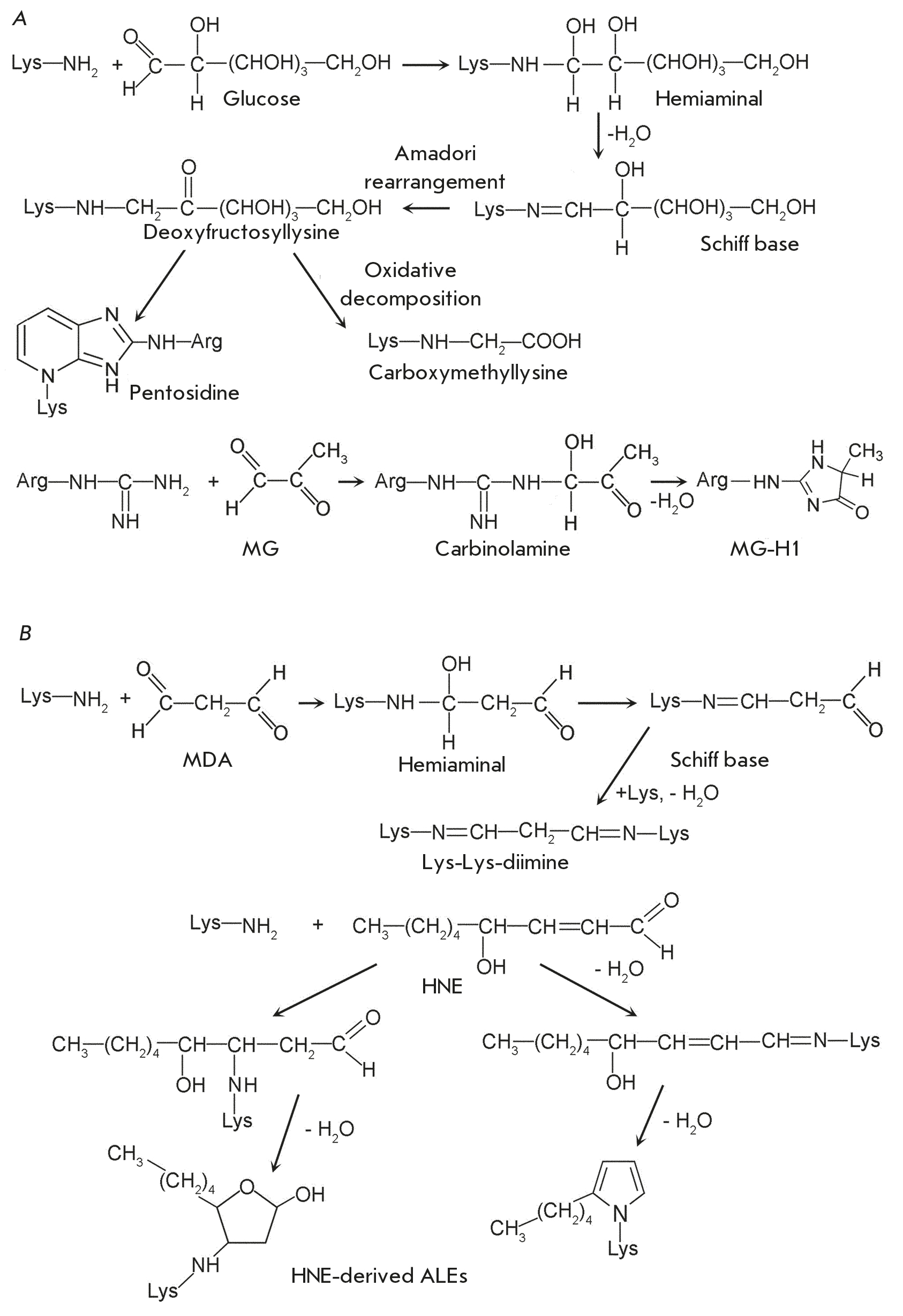 The mechanism of glycation, first studied over 100 years ago as a phenomenon of protein fructosylation during food preparation, is now known as the Maillard reaction. At elevated temperatures, spontaneous glucose and fructose degradation products bind to the ε-amino groups of protein lysine residues, forming Schiff bases that subsequently undergo Amadori rearrangement [23].