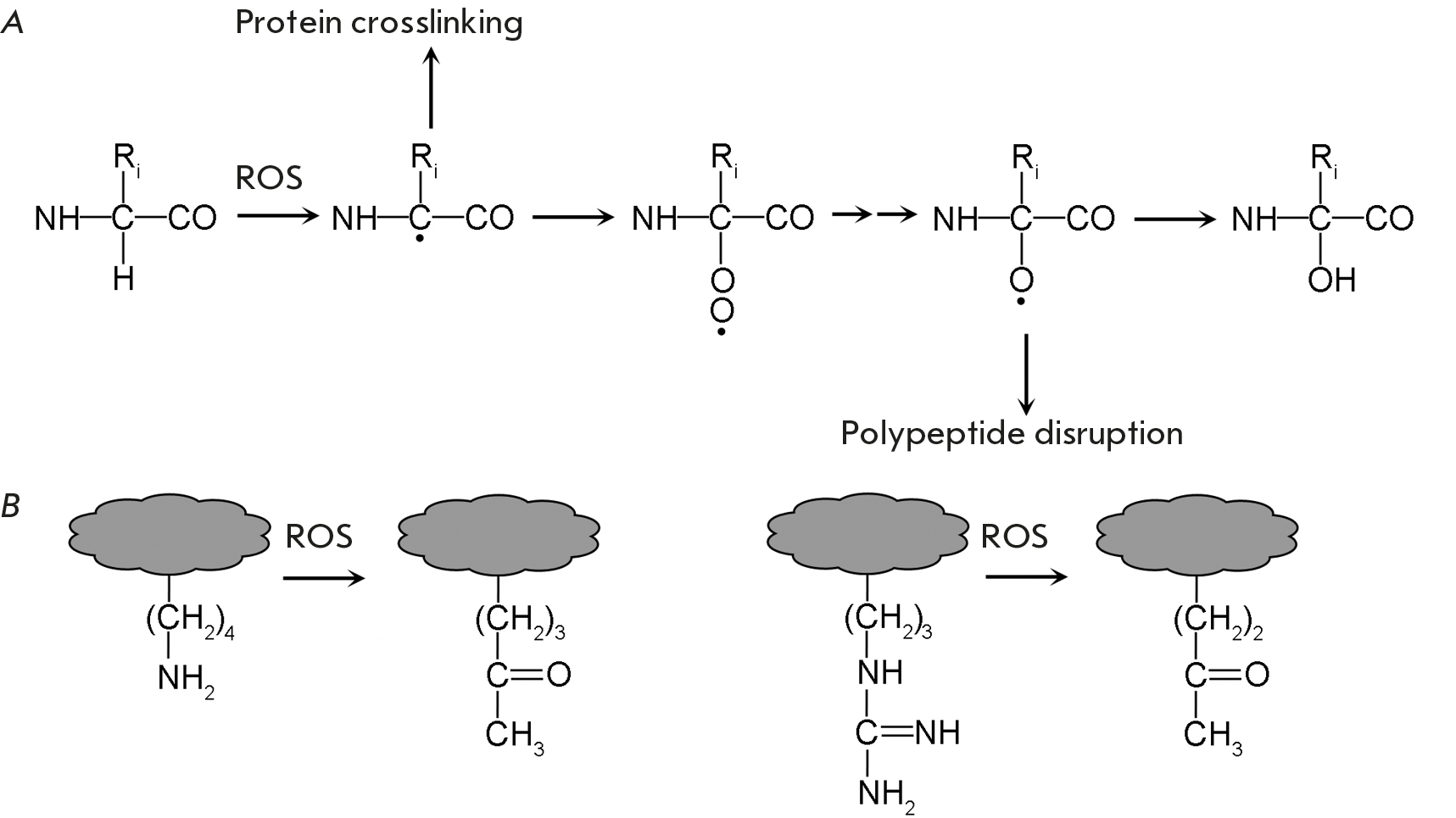 Fig. 4. Irreversible oxidation of the polypeptide chain (A) and amino acid side chains (B) under the action of ROS