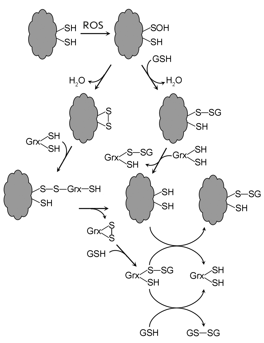 Fig. 7. Glutathionylation and deglutathionylation of proteins. Grx – glutaredoxins