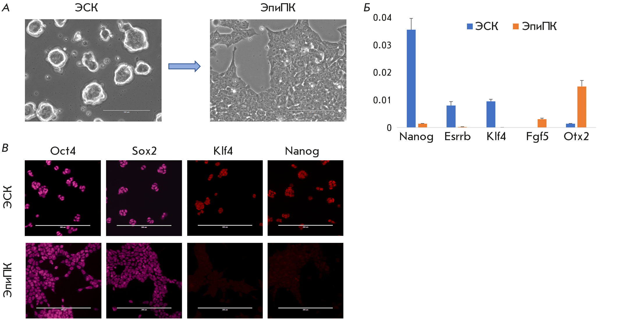 Fig. 1. Monitoring the naїve-to-EpiLC transition of pluripotency in vitro. (A) Phase-contrast microphotography of ESCs and EpiLCs. Scale bar, 100 μm. (B) RT-PCR analysis of cells during the transition from naїve and primed markers of pluripotency. Delta Cq values are shown; the analysis was made in triplicates; the Gapdh RNA level served as a reference. (C) Results of the immunocytochemical analysis of the obtained cells with antibodies against Oct4, Sox2, Klf4, and Nanog. Scale bar, 200 μm