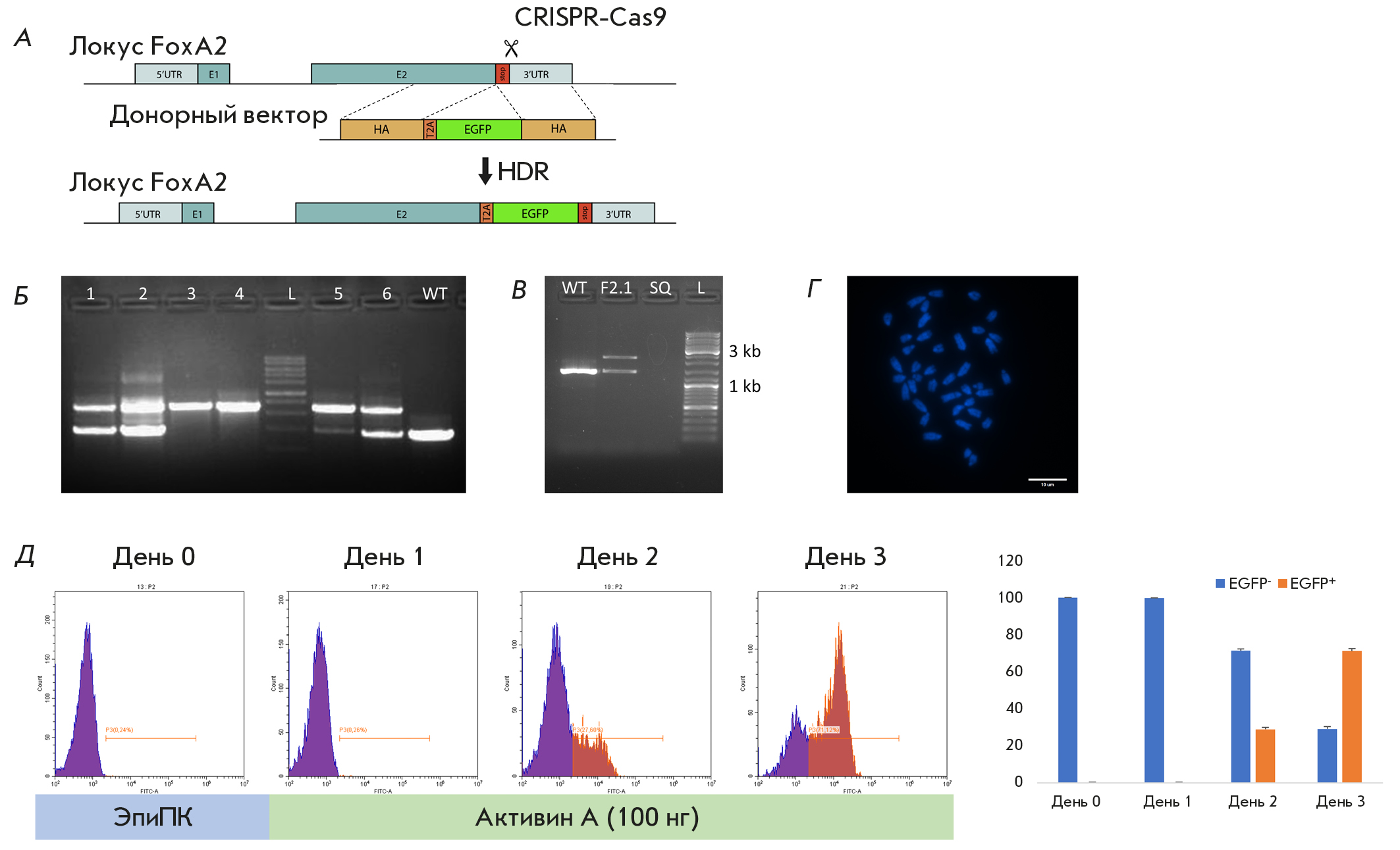 Fig. 3. Establishment of the Foxa2::T2A-EGFP reporter ESC line. (A) Schematic representation of the targeting strategy. E1, E2 – exons; HA – homology arm; UTR – untranslated region; stop – stop codon. (B) Insertion verification by PCR in picked ESC clones. Genomic DNA of the parental cell line (WT) was used as a control. (C) Repeated insertion verification in the subcloned cell line. (D) Normal karyotype (40 XY) of the established reporter ESC line F2.1. Scale bar, 10 μm. (E) Left panel – flow cytometry analysis of EGFP expression of the F2.1 ESCs during DE specification; right panel – percentage of EGFP– and EGFP+ cells during DE differentiation; results are expressed as the mean of three replicates ± SD