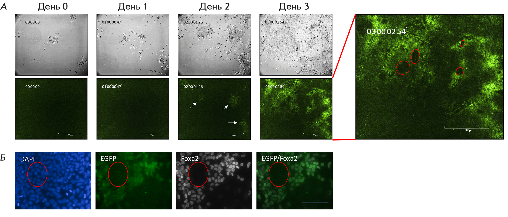 The Foxa2::TA2-EGFP donor vector and lentiCRISPRv2 plasmid harboring gRNA (500 ng with a 1 : 1 molar ratio) were co-transfected in ESCs using a FuGENE transfection reagent (Promega, USA) in a OptiMEM medium. Next day, cells were transferred onto a 10 cm gelatinized dish. One day later, 2 μg/mL puromycin (Merck) was added to the culture medium for two additional days. The cells were cultured for an additional 10 days without the addition of selective antibiotics. Then, single clones were picked, expanded, and tested for transgene insertion by PCR using the gtM_FoxA2 primers and LR HS-PCR kit (Biolabmix, Russia). The EGFP level during the differentiation experiments was measured by flow cytometry on a CytoFLEX system (Beckman Coulter) and by time-lapse microscopy on a CQ1 confocal system (Yokogawa).