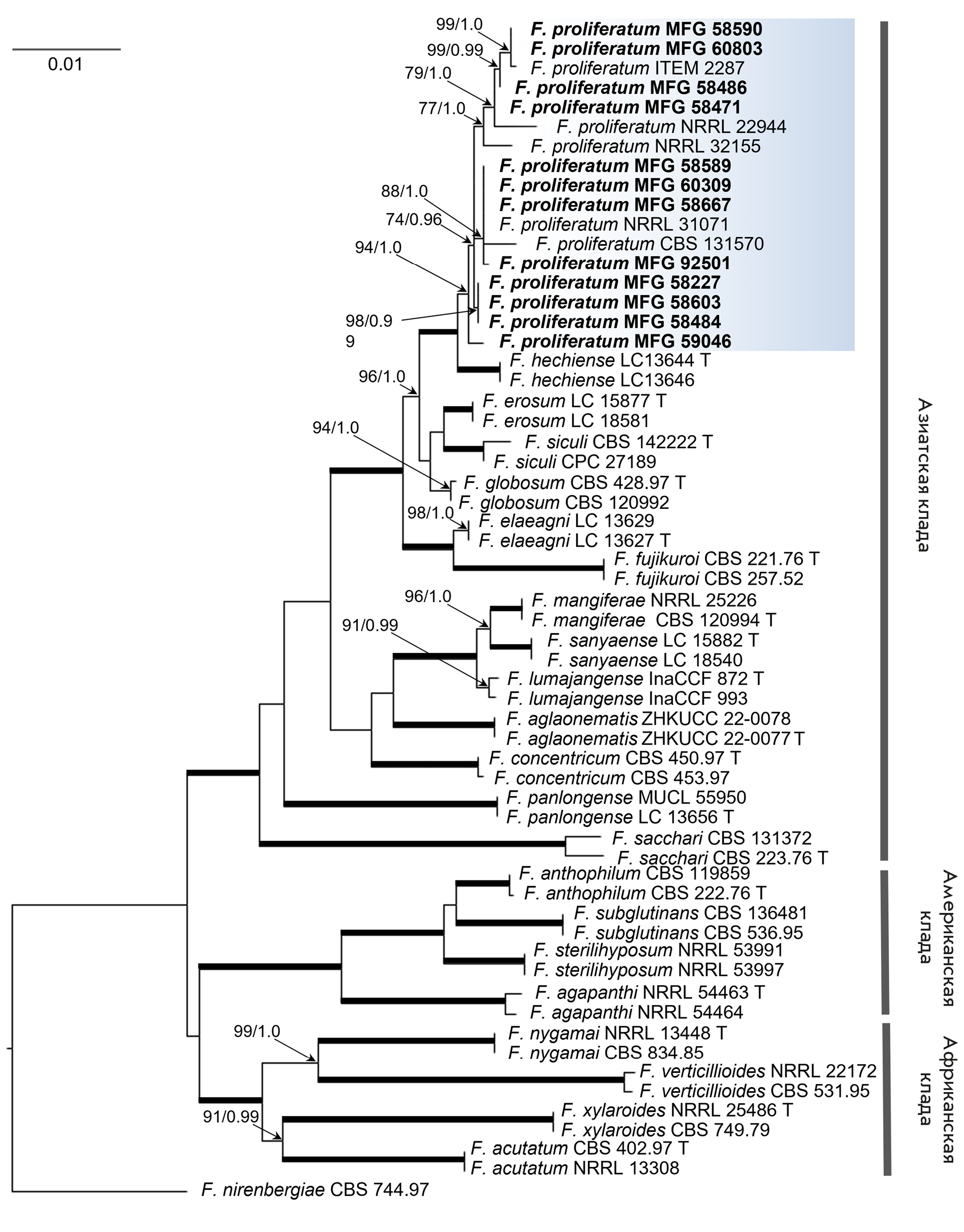 Fig. 2. Dendrogram of phylogenetic similarity of Fusarium spp. based on combined nucleotide sequences of the tef, tub, and rpb2 gene fragments by the ML method. Nodes show bootstrap support values (> 70%) in the ML analysis, as well as BP values (> 0.95). The thickening of lines signifies support at the 100/1.0 ML/BP level. Strains within the study, obtained from the MFG collection, are denoted in bold. F. nirenbergiae strain CBS 744.97 was designated as the outgroup