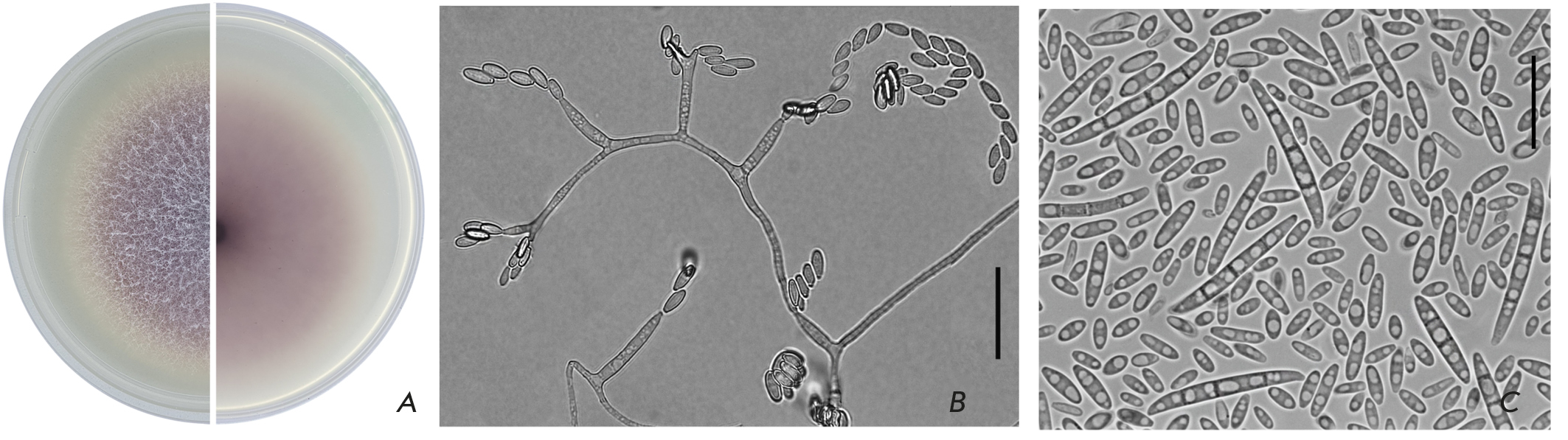 Fig. 1. (А) – culture of F. proliferatum MFG 58486 (potato-sucrose agar, 7 days, 25°C, in the dark); (B) – microconidia on mono- and polyphyalides; (C) – microconidia and macroconidia (synthetic Nirenberg agar, 14 days, 25°С, in the dark). Scale bars = 20 μm