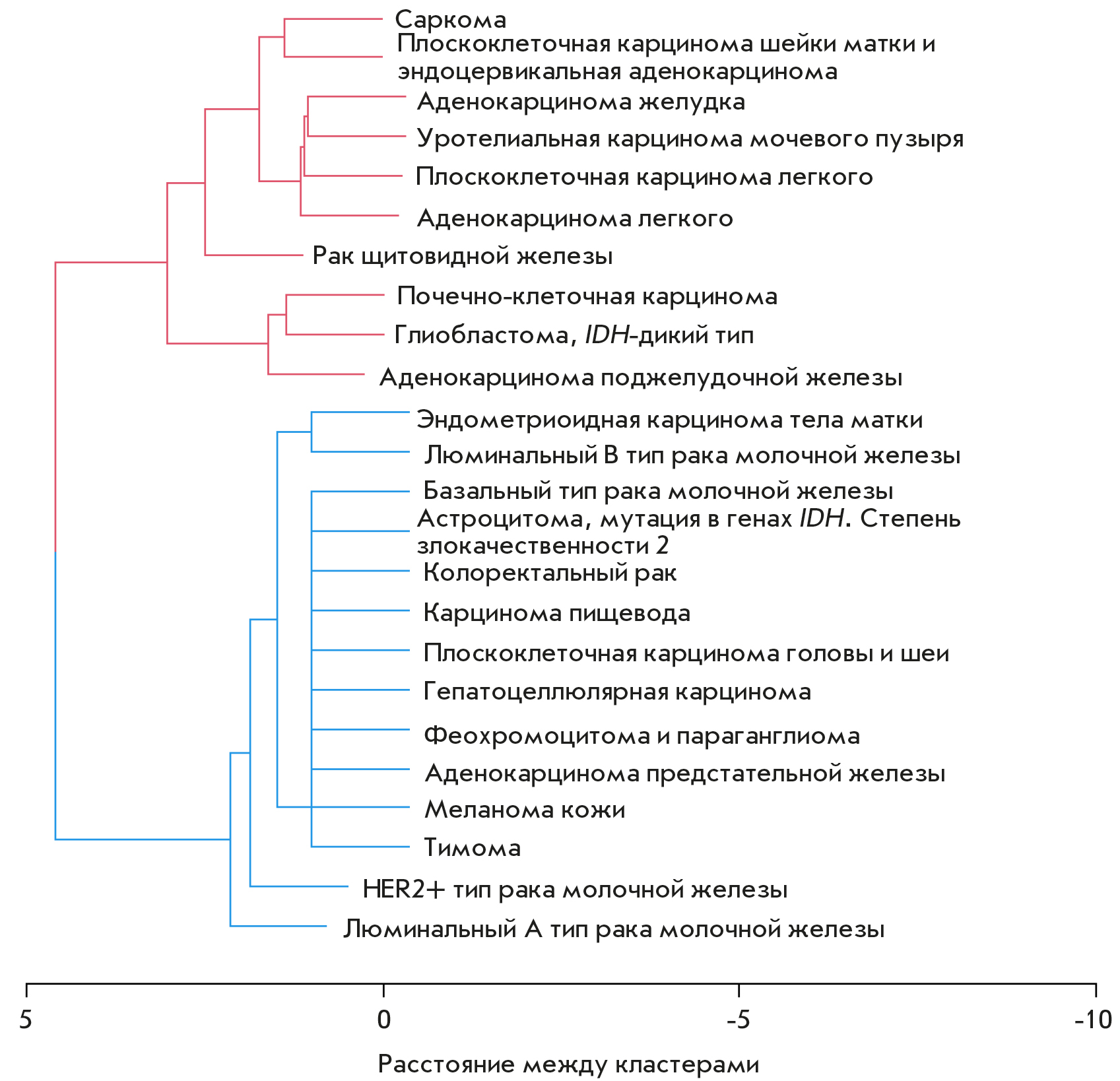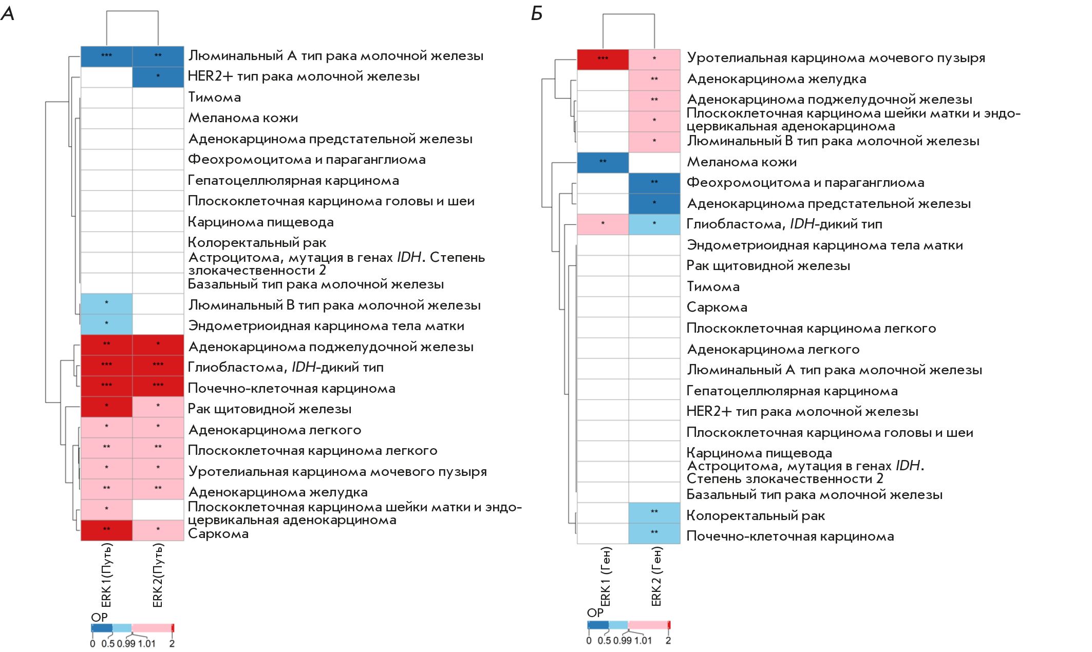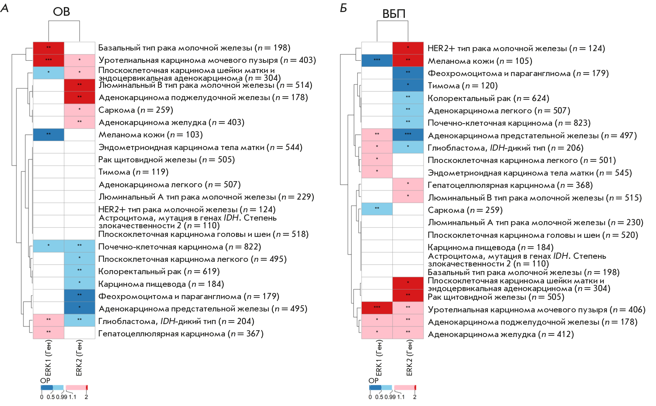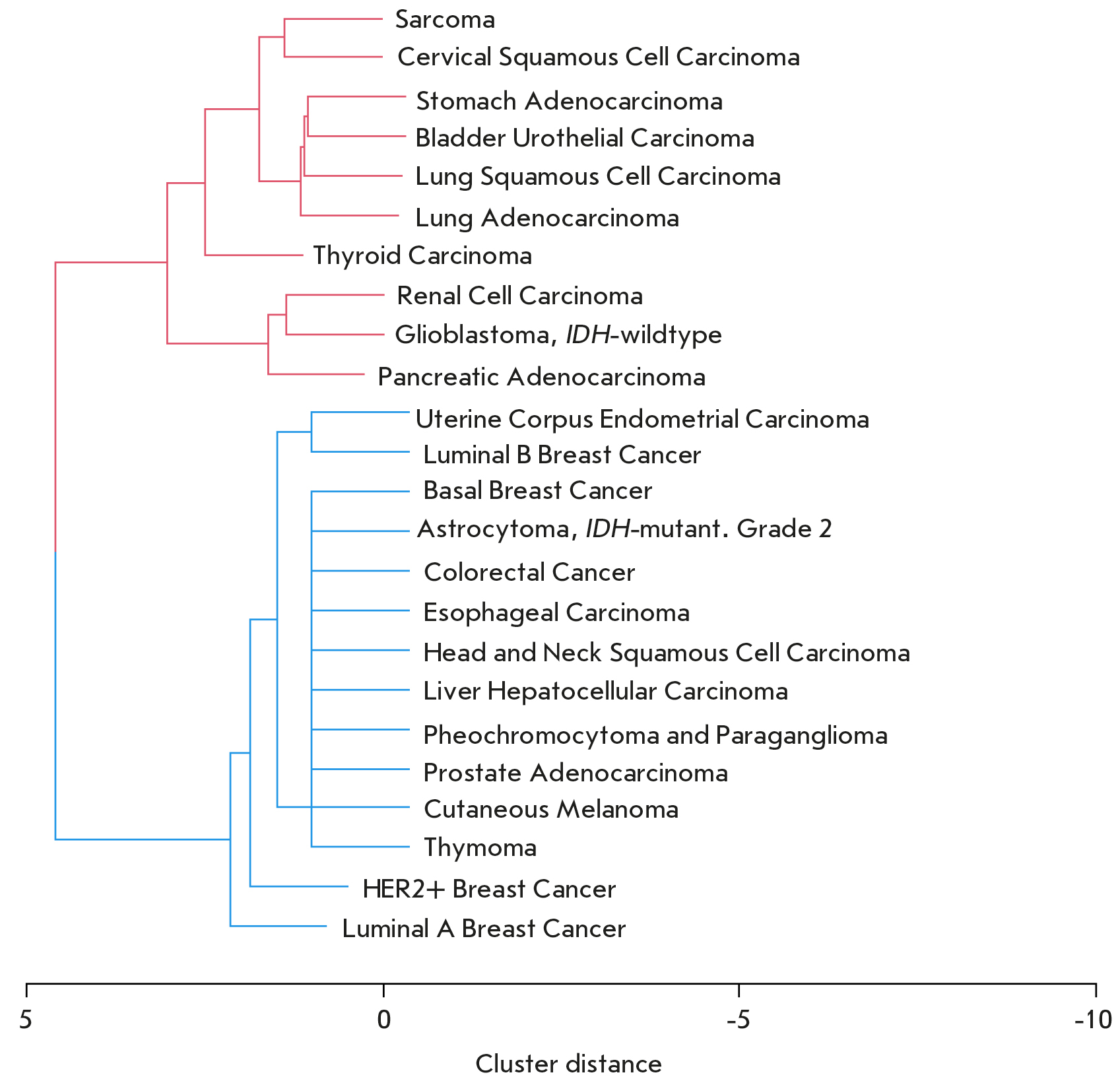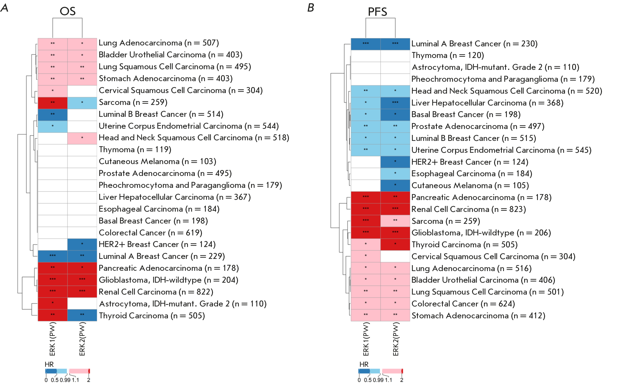 Дендрограмма демонстрирует два кластера, включающих 10 и 12 типов ЗНО, соответственно, в пределах которых активация молекулярных путей ERK1 и ERK2 имеет схожее прогностическое значение. В первый кластер из 10 типов ЗНО входят рак желудка, поджелудочной железы, легких, почек, мочевого пузыря, щитовидной железы, шейки матки, саркома и глиобластома, где активация путей ERK1/2 является скорее отрицательным прогностическим биомаркером (для 90–100% типов ЗНО из кластера 1). Во второй кластер включены 12 других типов рака, для которых активация данных путей либо является положительным прогностическим биомаркером (HER2+, люминальный А и люминальный В типы рака молочной железы, рак тела матки; всего 17–25% типов ЗНО из кластера 2), либо не обладает прогностической значимостью (базальный тип рака молочной железы, гепатоцеллюлярная карцинома, меланома и др.; всего ~75% типов ЗНО из кластера 2).
