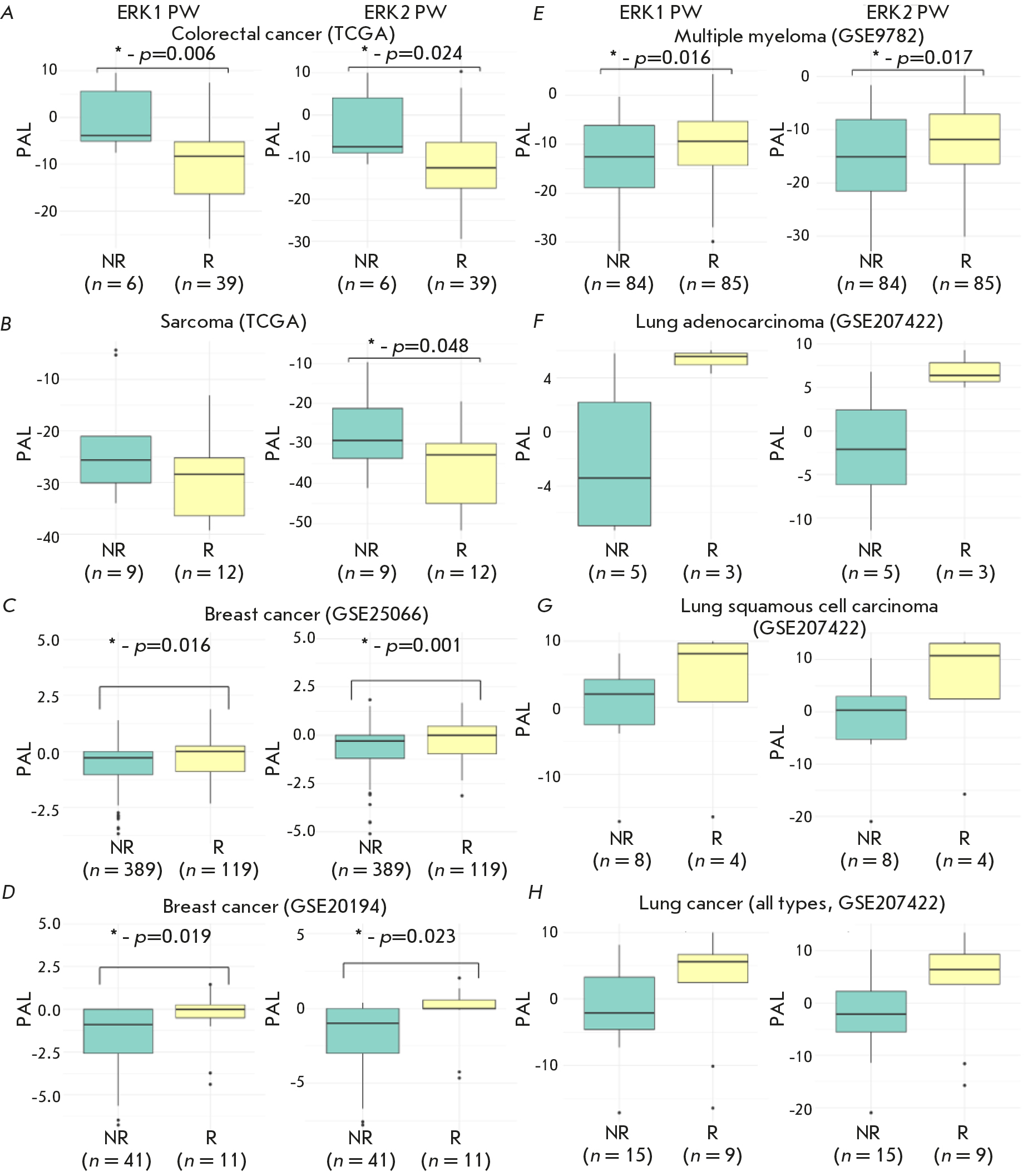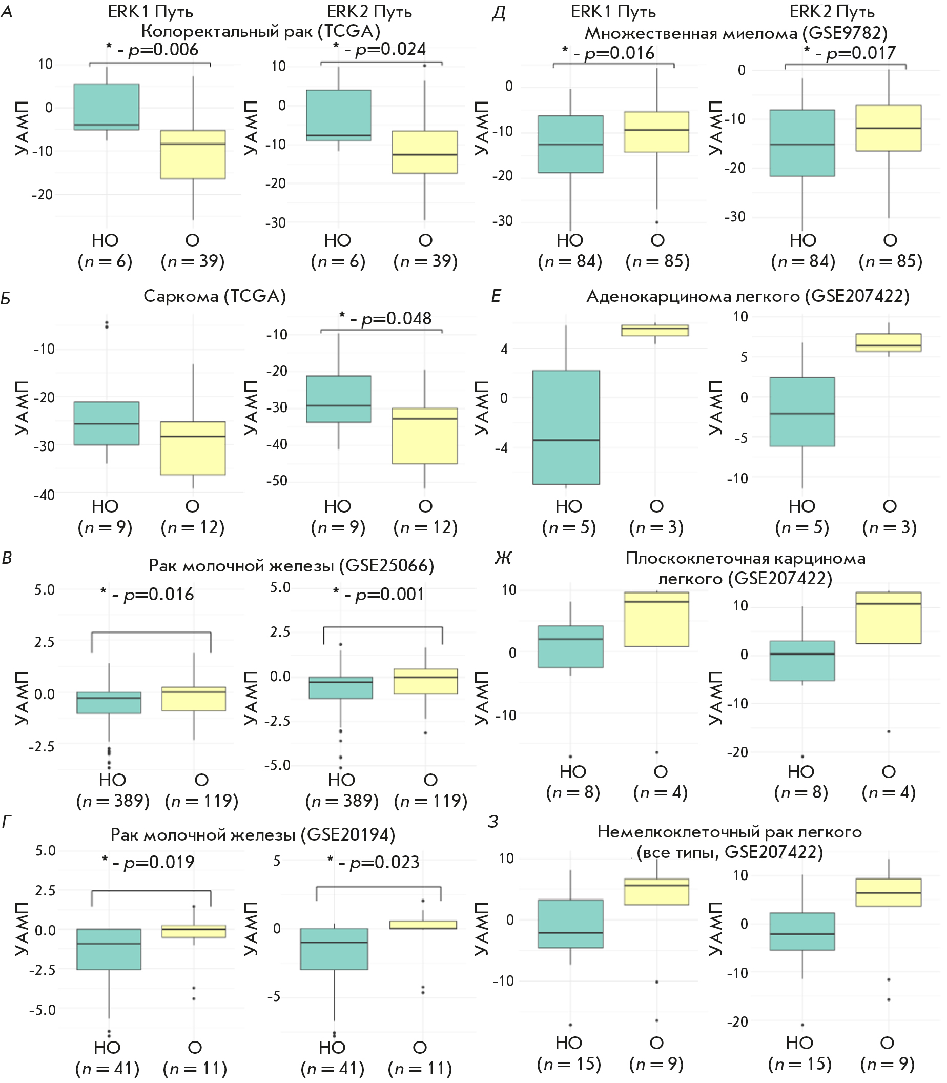 Рис. 6. Различия в УАМП исследуемых молекулярных путей в зависимости от ответа на терапию: А – комбинацией 5-фторурацила, лейковорина и оксалиплатина у пациентов с колоректальным раком из проекта TCGA; Б – комбинацией доцетаксела и гемцитабина у пациентов с саркомой из проекта TCGA; В – таксанами и антрациклином у пациентов с раком молочной железы из набора данных GSE25066; Г – с таксанами и антрациклином у пациентов с раком молочной железы из набора данных GSE20194; Д – с бортезомибом у пациентов с множественной миеломой из набора данных GSE9782; Е – с иммунотерапией у пациентов с аденокарциномой легкого из набора данных GSE207422; Ж – с иммунотерапией у пациентов с плоскоклеточной карциномой легкого из набора данных GSE207422; З – с иммунотерапией у пациентов с раком легкого (все гистологические типы) из набора данных GSE207422. Результаты анализа ответа по RECIST представлены в виде диаграмм размаха, где горизонтальная линия представляет медиану, первый и третий квартили – нижнюю и верхнюю границы прямоугольника, минимальные и максимальные наблюдаемые значения обозначены концами вертикальных линий, а возможные выбросы показаны отдельными точками. Статистически значимые различия отмечены * с указанием точного p-значения. «О» означает ответивших на лечение, «НО» – не ответивших