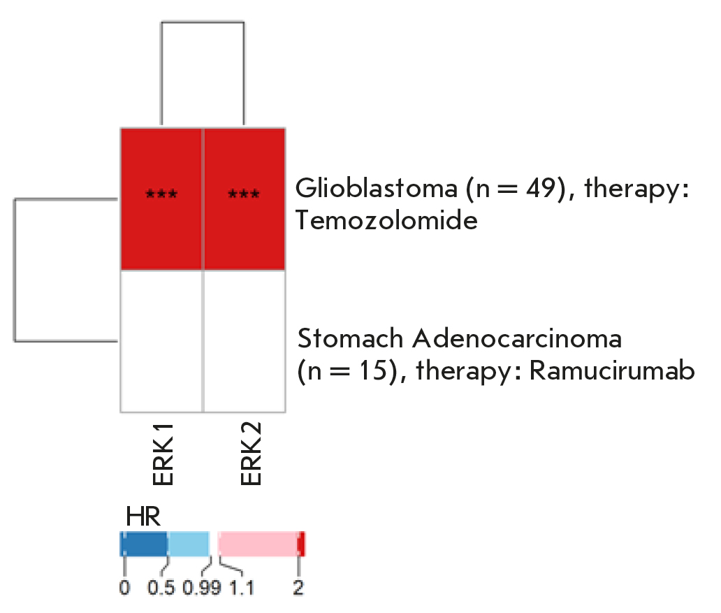 Рис. 7. Тепловая карта значений отношения рисков, рассчитанных для активации молекулярных путей ERK1 и ERK2 на основе активации молекулярных путей в зависимости от ответа на противоопухолевую химиотерапию по показателю выживаемости без прогрессирования (ВБП). ОР – отношение рисков, *** – p < 0.001