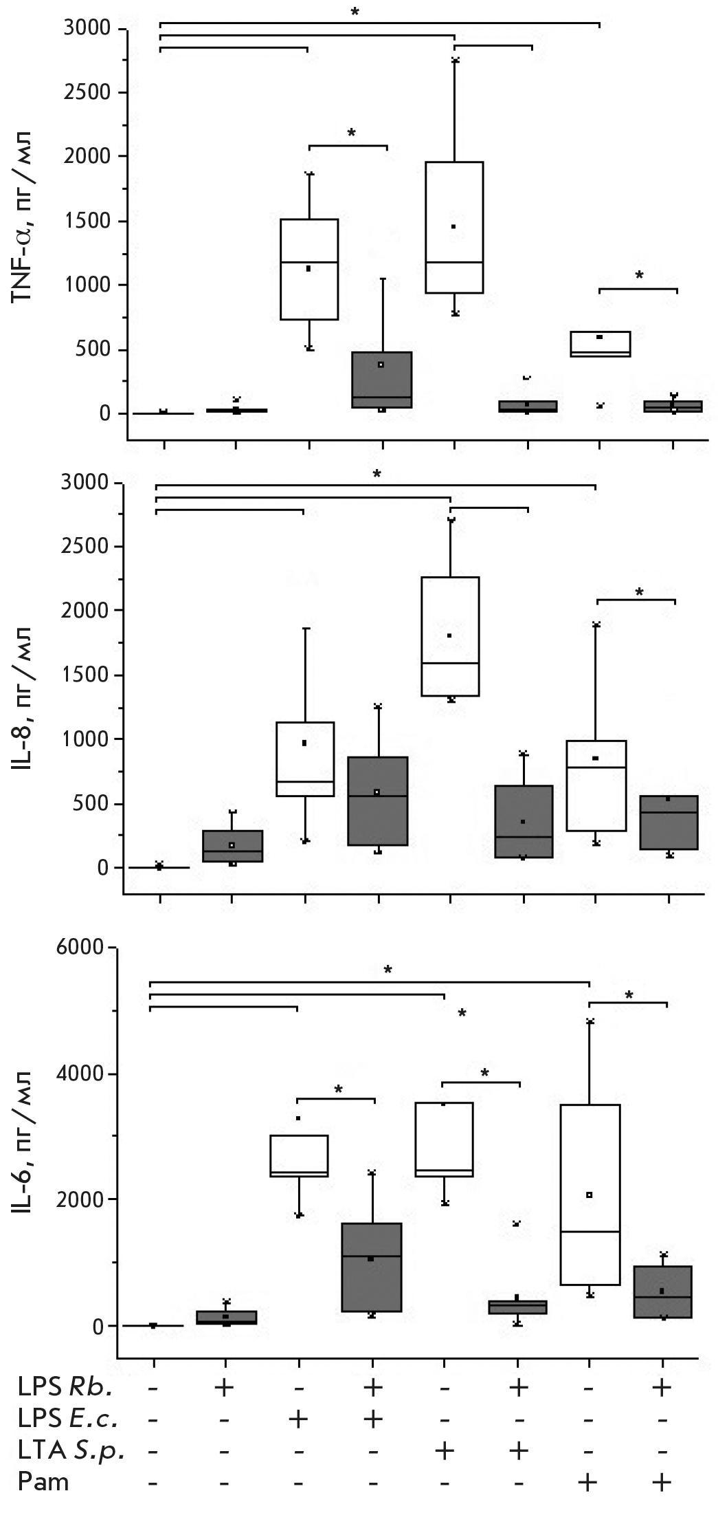 The specific receptors TLR2 and TLR4, which provide an adequate immune response to various pathogens, are the most important elements in cytokine synthesis activation. We analyzed the activation of the synthesis of the cytokines TNF-α and IL-6 and chemokine IL-8 by the following TLR2 and TLR4 ligands in human whole blood cells in a single series of experiments: E. coli LPS, S. pyogenes LTA, and Pam3CSK4. Activating ligands stimulated the production of TNF-α, IL-6, and IL-8 by blood cells at levels significantly above those in the control (Fig. 1).