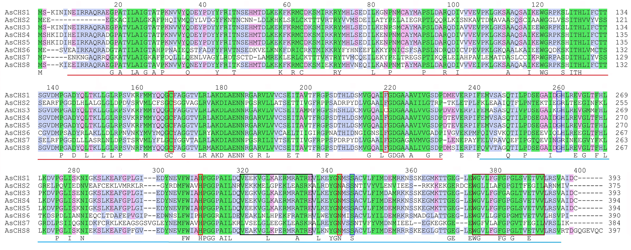 Fig. 2. Alignment of AsCHS1–8 amino acid sequences. The Chal_sti_synt_N and Chal_sti_synt_C domains are underlined by red and blue lines, respectively. Four residues (Cys167, Phe218, His309, Asn342) of the enzyme’s active site are framed in red (according to [15]). Residues Ser345 and Gly259, involved in the binding of the 4-coumaroyl-CoA substrate [10], are framed in blue. The black and brown frames highlight the chalcone synthase malonyl-CoA binding consensus and signature sequences, respectively [10]. The background color indicates a high degree of amino acid conservation in AsCHS1–8 proteins (green – 100%, blue – 80%, and pink – 60%)