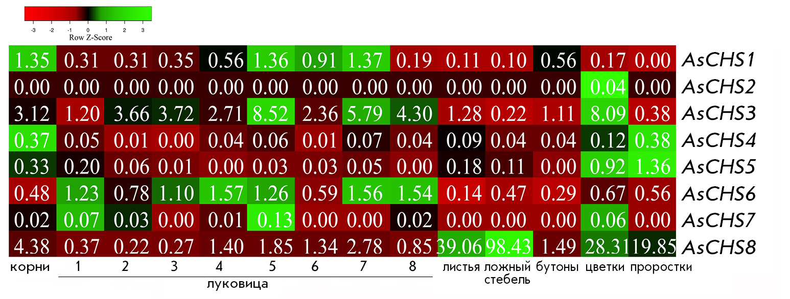 Significant transcript levels (FPKM >10) were found only for the AsCHS8 gene. The AsCHS8 gene is expressed in all analyzed organs, with the highest FPKM values being present in the pseudostem, leaves, flowers, and sprouts; in the bulb, expression is minimal throughout all eight developmental stages; in the roots, FPKM is ~9-fold lower than that in the leaves (Fig. 4).