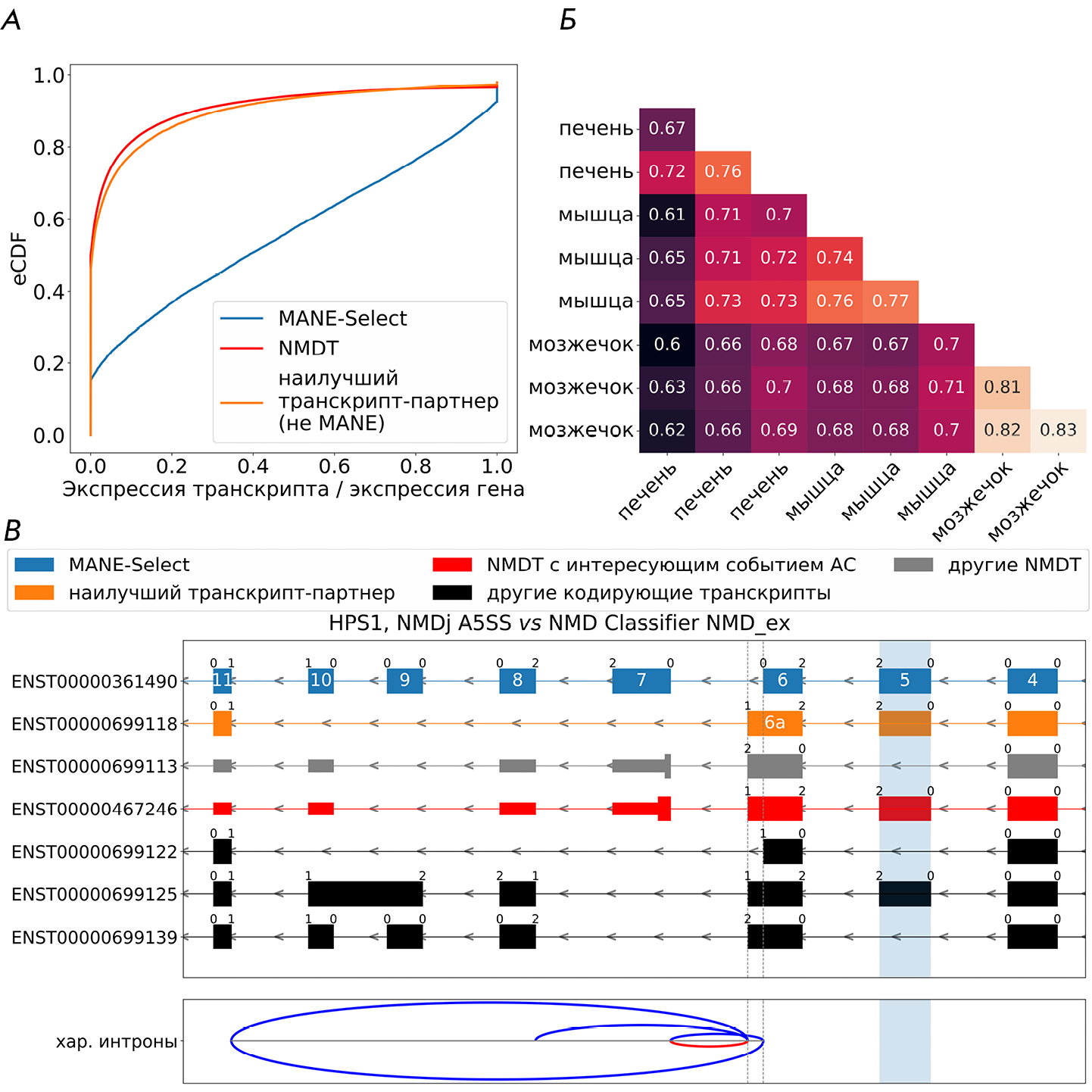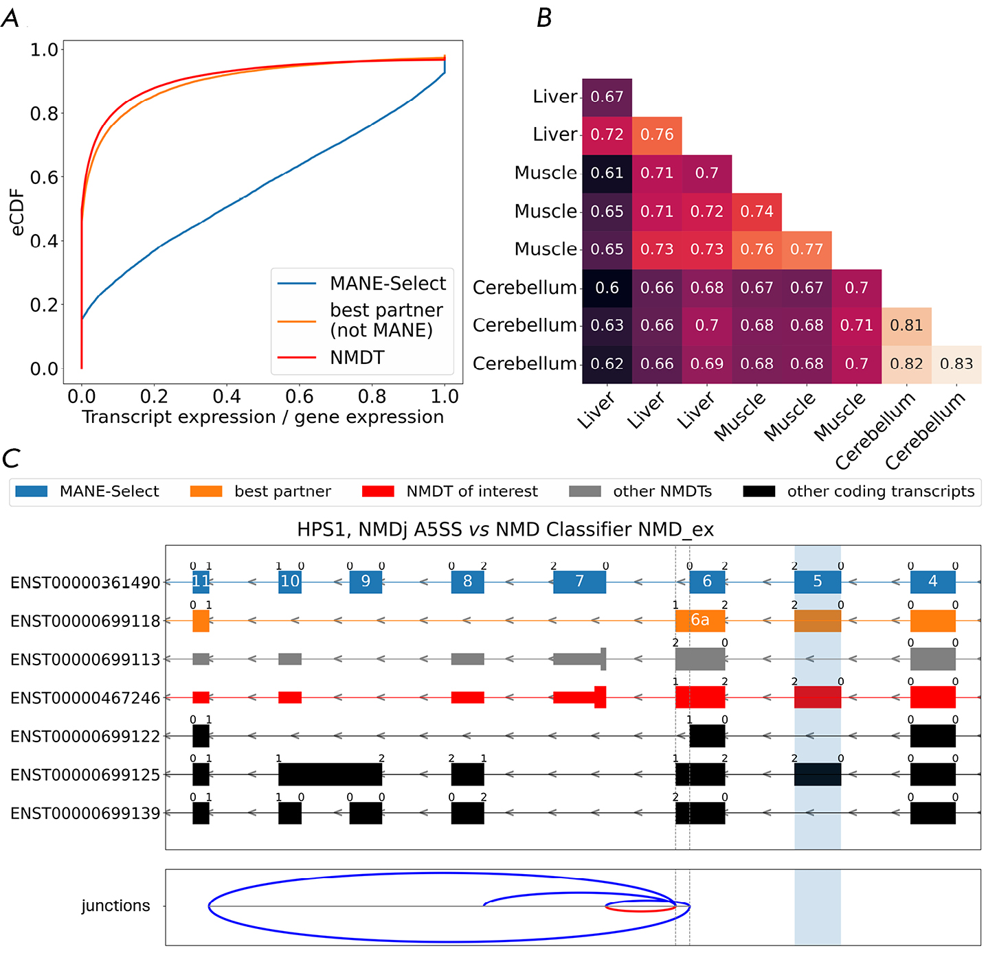Fig. 2. NMDj and NMD Classifier best partner transcripts. (A) Transcript relative abundance (eCDF is the cumulative distribution function) estimated from a random sample of RNA-seq experiments from GTEx. (B) The proportion of genes whose most expressed transcripts match between pairs of GTEx tissue samples. (C) An example of a local NMD-generating event in the HPS1 gene. The characteristic introns originating from NMDTs and protein-coding transcripts are shown by red and blue arcs, respectively. The phase of the reading frame is indicated above the exon boundaries. Transcript colors: MANE-Select (blue), NMDT (red), best partner transcript from NMD Classifier (orange), other transcripts (gray – NMDT, black — protein-coding). The essential exon predicted by the NMD classifier is highlighted in light-blue; however, NMDT is actually generated by a splice site shift in the MANE-Select isoform