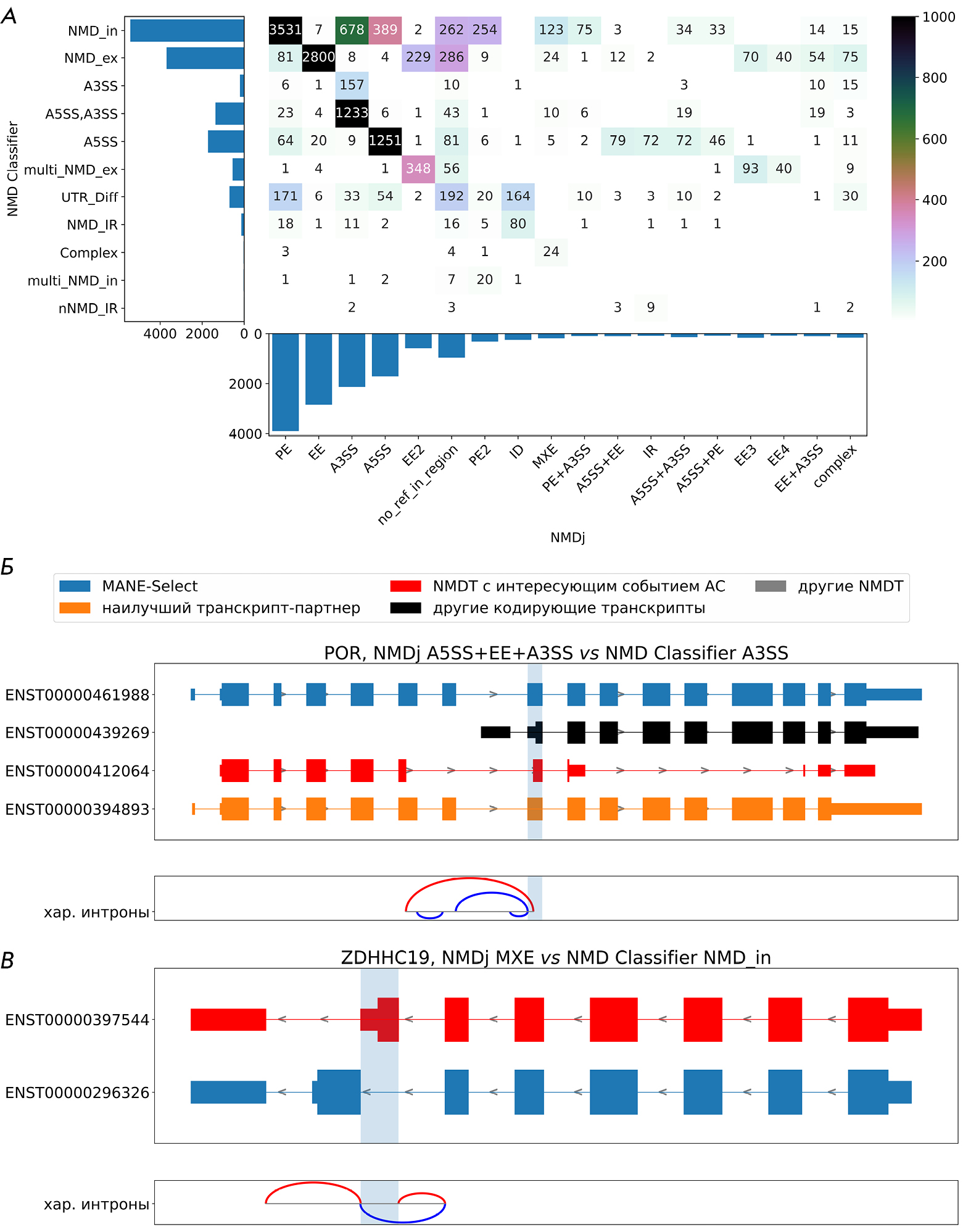 We compared the classification of AS events produced by NMDj and NMD Classifier in application to the same human transcriptome annotation (Fig. 3A). NMDj was configured to use MANE-Select transcripts as a reference. Out of 15,914 NMDTs, NMD Classifier and NMDj were able to classify AS events for 15,446 and 15,265 NMDTs, respectively. However, AS events were classified into the same type (Table 1) for only 60% of NMDTs.