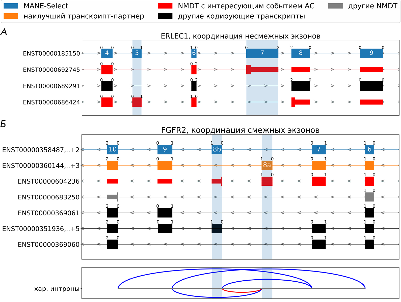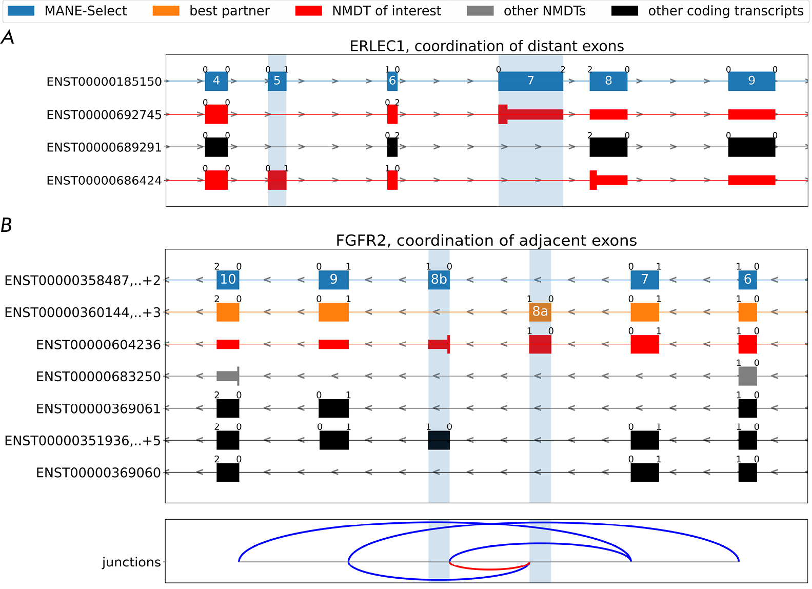 Fig. 5. (A) Coordinated splicing of distant cassette exons in the ERLEC1 gene. (B) Coordinated splicing of adjacent exons in the FGFR2 gene. Besides mutually exclusive splicing of exons 8a and 8b, transcript isoforms with coordinated skipping of exons 7–9 (NMDT) and ones with coordinated skipping of exons 7–8a,b and 8a,b–9 (protein-coding) are annotated. Simultaneous inclusion of exons 8a and 8b generates NMDT. Legend colors are as in Fig. 2