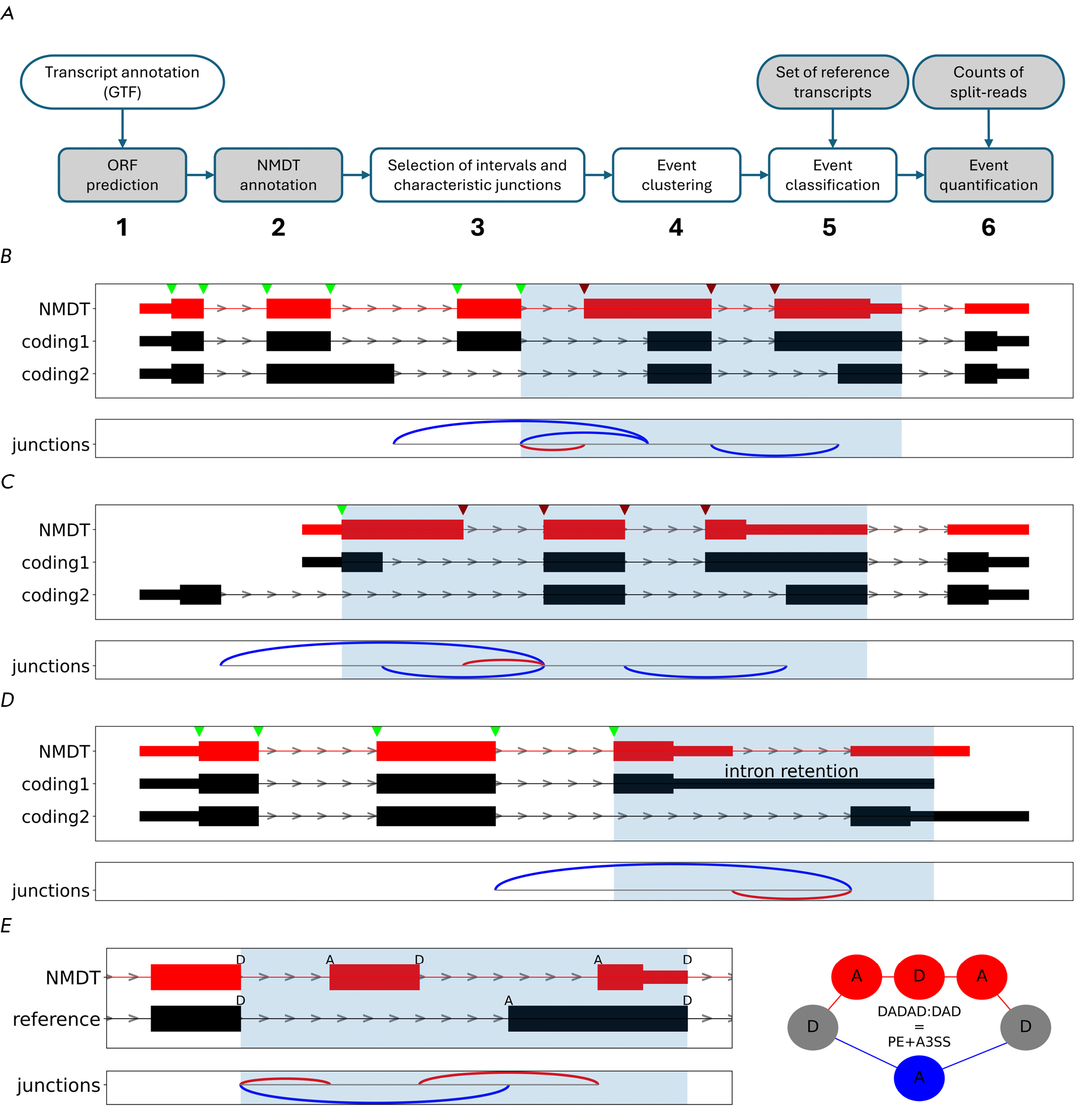 In revisiting this problem, we developed NMDj, a tool for systematic search, classification and quantification of NMDT-generating AS events which takes into account all annotated transcripts and reports all introns that distinguish NMDTs from protein-coding transcripts. NMDj provides a more detailed classification of NMDT-generating AS events than the NMD Classifier. The coupling between NMD and AS is a crucial post-transcriptional mechanism of gene expression regulation [15]. Therefore, developing a method for searching, classifying, and quantifying AS events leading to NMDT which would take into account all the diversity of transcript isoforms is challenging. The NMDj method is aimed at tackling exactly this problem. It receives a set of transcripts in the form of an annotation database or transcript models constructed from RNA sequencing data as input, and provides the characterization of NMDT-generating AS events and their quantification as output.