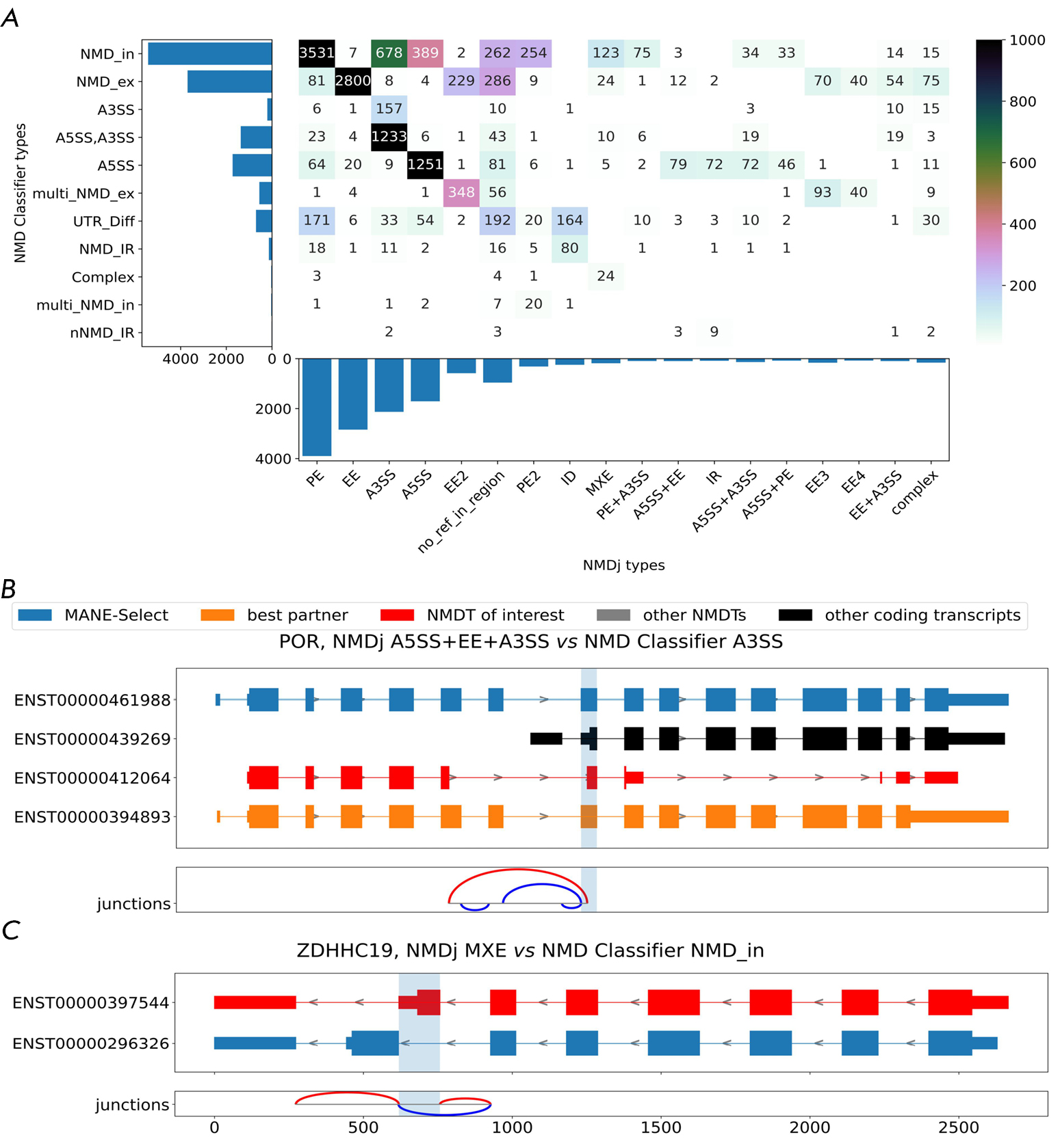 Fig. 3. AS event categorization. (A) A comparison of classifications by NMDj and NMD Classifier. Each cell represents the number of NMDTs classified into corresponding types by NMDj (rows) and NMD Classifier (columns). (B, C) Examples of rare NMD-generating AS events. The rest of the legend is as in Fig. 2