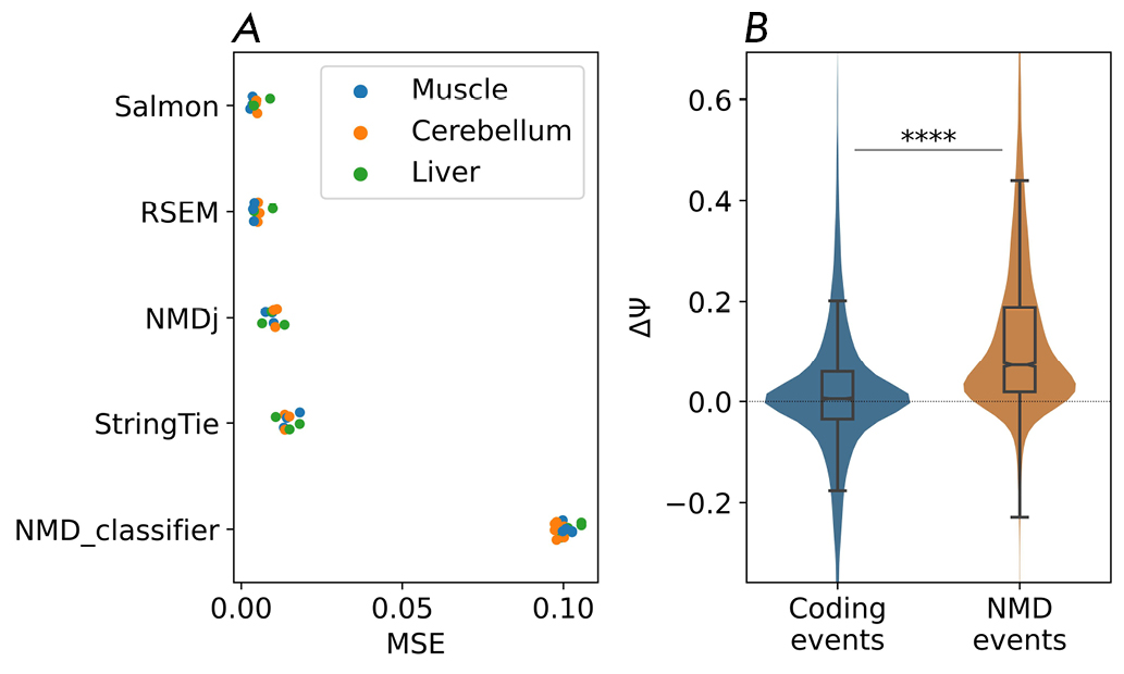 Fig. 4. Comparison of NMDj and NMD Classifier predictions. (A) Mean squared error (MSE) of Ψ values estimated by different methods from simulated RNA-Seq data relative to the ground truth values. (B) Statistically significant splicing changes of NMDT-generating and non-NMDT protein-coding AS events (cassette exons, alternative splice sites and intron retention) upon NMD inactivation by cycloheximide, quantified by NMDj. **** denotes statistically significant differences at the 0.1% significance level (Mann–Whitney test)