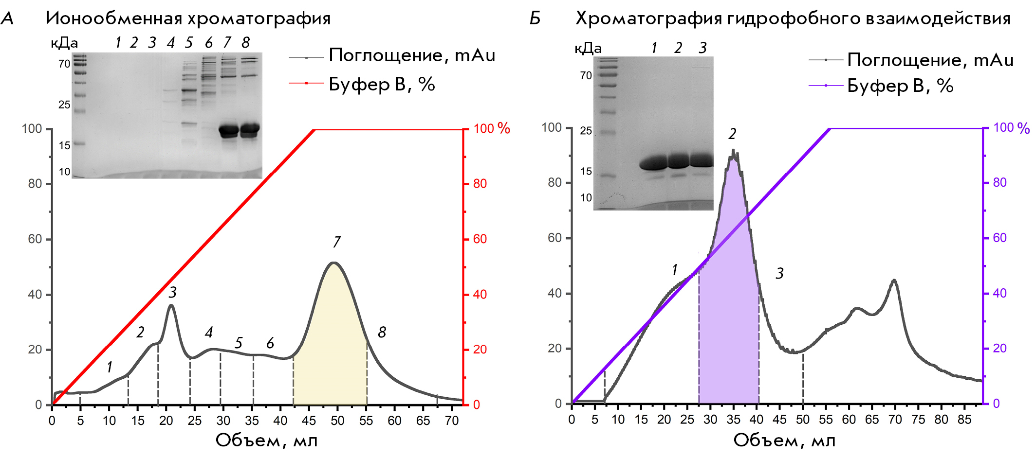 Fig. 1. (A) Ion exchange chromatography of samples after periplasmic lysis. The peak highlighted in color corresponds to the fraction containing the largest amount of α-synuclein. The inset at the top left-hand side shows the electrophoresis of protein fractions after ion exchange chromatography. (B) Hydrophobic interaction chromatography of samples after ion exchange chromatography. The peak highlighted in color corresponds to the fraction containing the highest amount of α-synuclein. The inset at the top left-hand side shows the electrophoresis of protein fractions after hydrophobic interaction chromatography. The molecular weight of the target protein is 19 kDa (apparent molecular weight). The peak number on the chromatographic profiles corresponds to the PAGE lane number