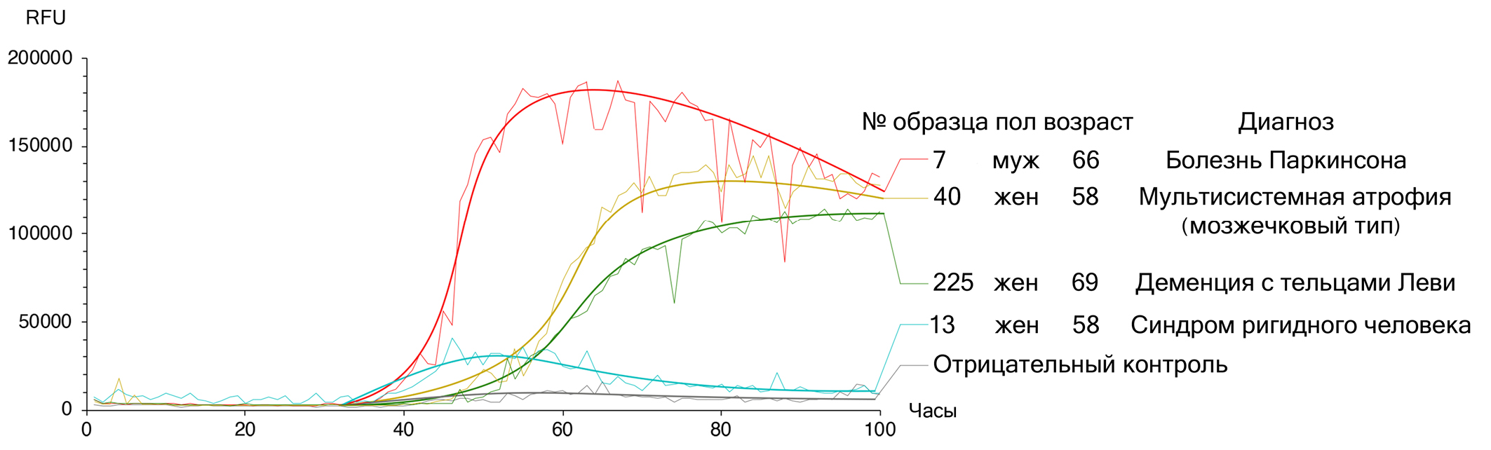 Fig. 3. Curves of pathological α-synuclein amplification in patients (RFU – relative fluorescence units). Analysis of samples from patients with stiff-person syndrome (blue), Lewy body dementia (green), multiple system atrophy of the cerebellar type (yellow), and Parkinson’s disease (red)
