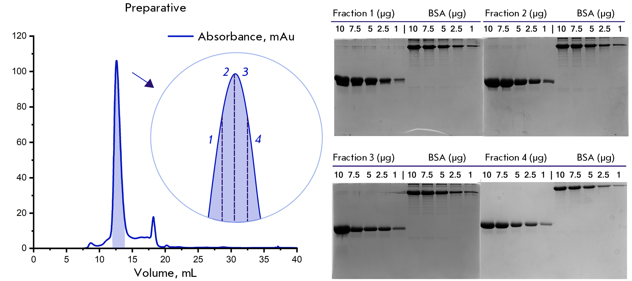 Fig. 2. Size exclusion chromatography of α-synuclein. The peak highlighted in color corresponds to the fraction containing the target protein. At the top right-hand side, images of the denaturing electrophoresis of protein fractions are shown. α-Synuclein fractions at different concentrations (10, 7.5, 5, 2.5, and 1 μg) are presented on the left, and the molecular weight marker (BSA) at the same concentrations is presented on the right. The fraction numbers on the chromatogram correspond to those on PAGE images
