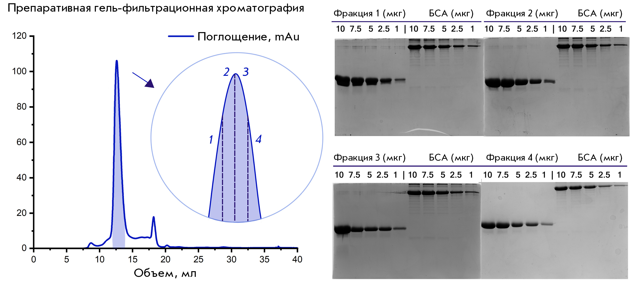 Рис. 2. Гель-фильтрационная хроматография белкового препарата α-синуклеина (mAu – единица оптической плотности). Пик, выделенный цветом, соответствует фракции, содержащей целевой белок. Справа показан денатурирующий электрофорез белковых фракций, где слева нанесена соответствующая фракция α-синуклеина в различной концентрации (10, 7.5, 5, 2.5 и 1 мкг), а справа в качестве калибратора нанесен бычий сывороточный альбумин (БСА) в тех же концентрациях. Номера фракций на хроматограмме соответствуют номерам проб на ПААГ